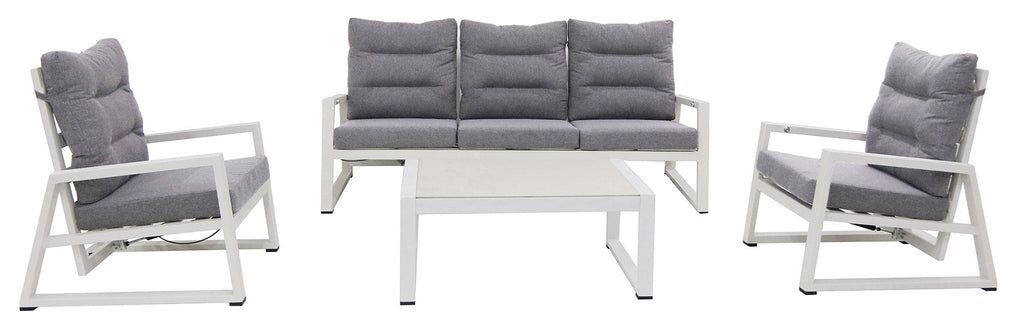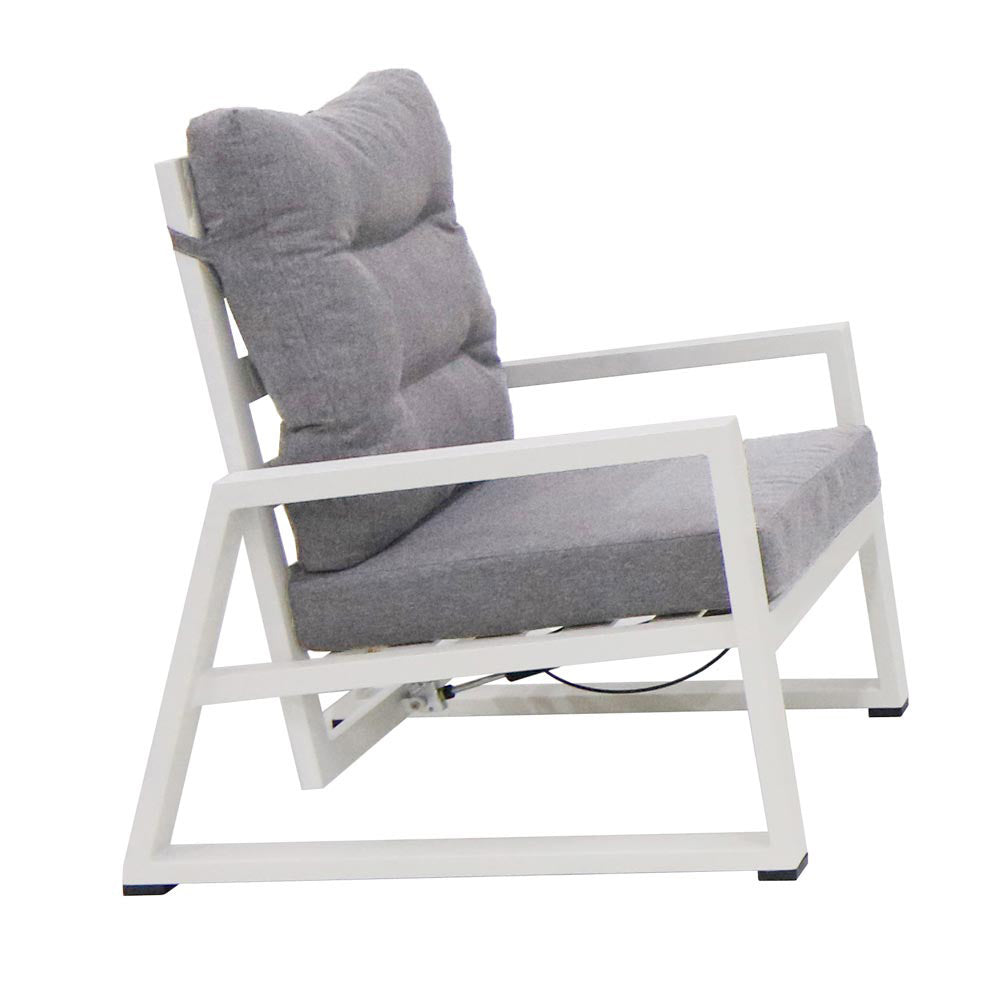 Mikonos ist ein Lounge-Set aus Aluminium für offene Räume mit verstellbaren Rückenlehnen und abnehmbaren Kissen.