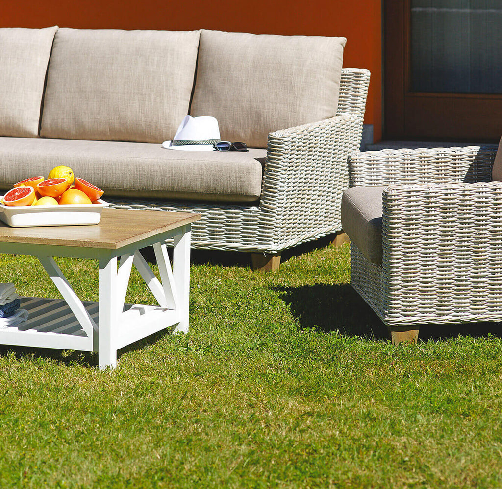 Garten-Lounge-Set in gebleichtem grauem Kubu-Sofa, 2 Sesseln und Couchtisch Vorghini Jaipur