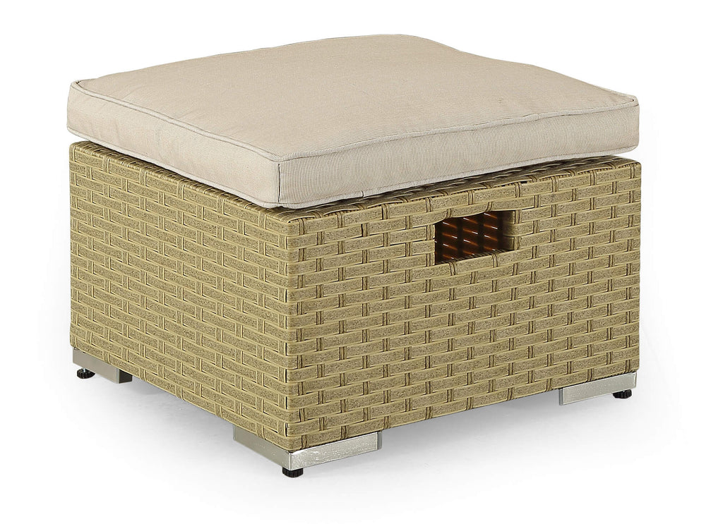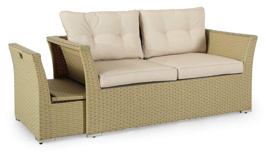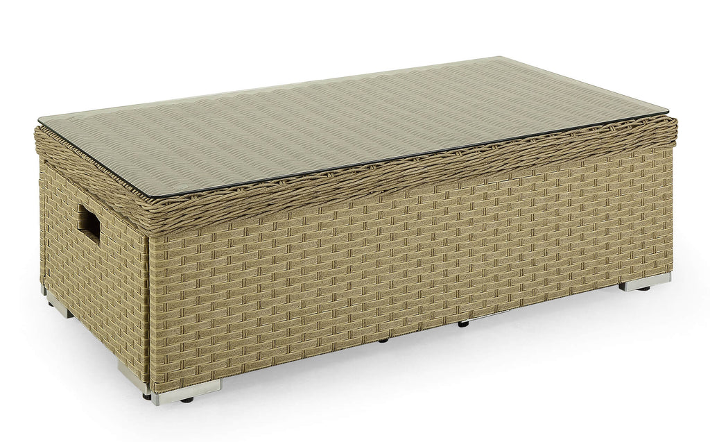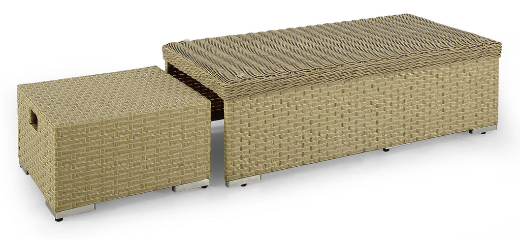 Der Stil dieser Lounge im Freien ist elegant und raffiniert und kann jede Umgebung aufwerten, in der sie aufgestellt wird, vom Garten bis zur Terrasse, vom Pool bis zu den mit Pergolen oder Markisen überdachten Räumen. Besonders bequem ist das Set aus Tisch, Sofa, 2 Sesseln und 2 Hockern, die auch als Sitzgelegenheit genutzt werden können, auch durch die weichen und großen Kissen. Der Couchtisch mit Platte aus gehärtetem Glas garantiert Sicherheit und maximale Widerstandsfähigkeit sowie ein zeitgemäßes und raffiniertes Design. Die Möglichkeit, die Sessel im Sofa und die Fußstützen unter dem Tisch zu verstauen, macht diesen Artikel auch im Hinblick auf die Optimierung vorhandener Räume äußerst funktional. Die vollständig aus Aluminium gefertigte Struktur und das Bezugsmaterial aus synthetischem Rattan garantieren eine langlebige Qualität, die gegen Witterungseinflüsse und UV-Strahlen beständig ist.