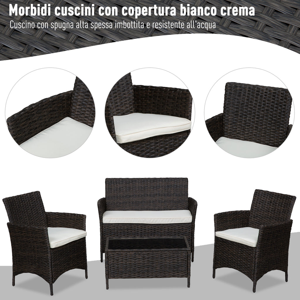 Fehlt Ihrer Terrasse etwas? Mit diesem Gartenmöbel-Set können Sie Ihre Außenbereiche mit Stil beleben und einrichten. Es besteht aus 1 Zweisitzer-Sofa, 2 Sesseln und einem Couchtisch mit Aufbewahrungsfunktion. Alle Stücke haben eine Metallstruktur, die mit handgewebtem tabakfarbenem synthetischem Rattan bedeckt ist. Dieses Material, das in der Lage ist, die Textur und die Nuancen des natürlichen Weidengeflechts perfekt zu reproduzieren, ist wasserdicht, widerstandsfähig und UV-beständig. Worauf warten Sie noch, ändern Sie das Aussehen Ihres Gartens mit!