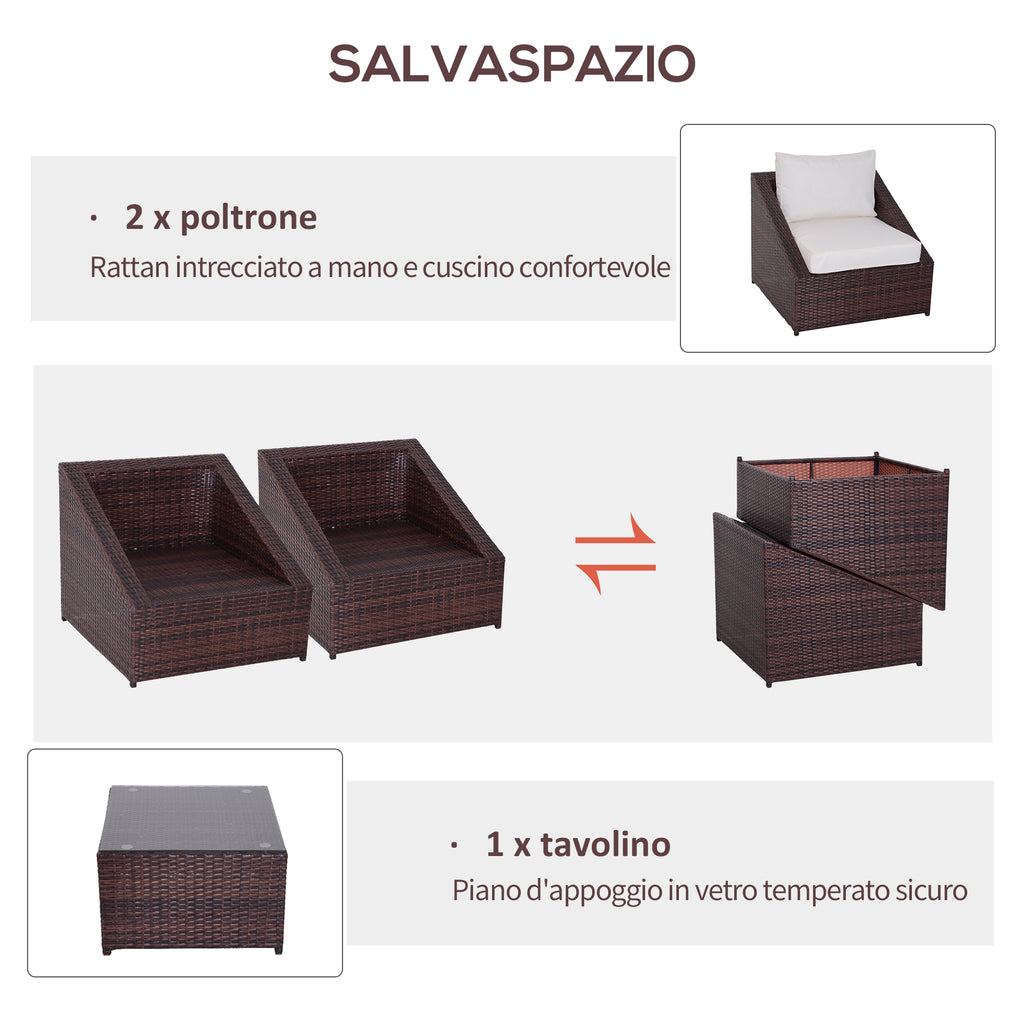 Modernes Gartenmöbel-Set aus Rattan, bestehend aus 2 bequemen Sesseln mit Kissen und einem Couchtisch, ideal, um Momente purer Entspannung im Freien zu genießen