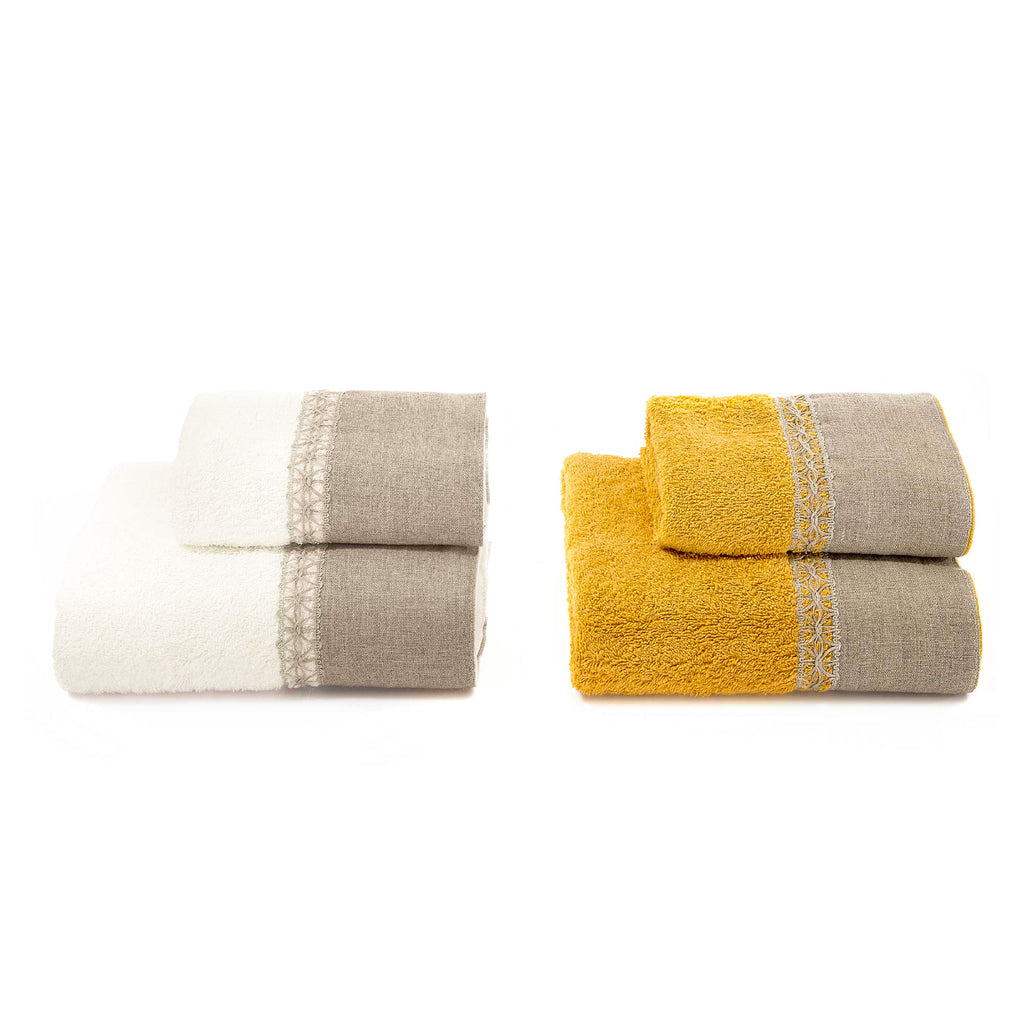 2 Handtücher + 2 Gästetücher aus reinem Baumwollfrottee 430 g/m2 mit Volant und Leinenspitze. Alle Artikel des Sets werden in Italien nach toskanischer Textiltradition hergestellt und verpackt.