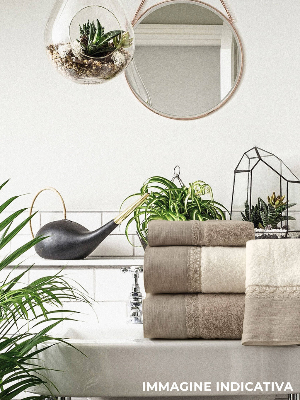 2 Handtücher + 2 Gästetücher aus reinem Baumwollfrottee 430 g/m2 mit Volant und Leinenspitze. Alle Artikel des Sets werden in Italien nach toskanischer Textiltradition hergestellt und verpackt.