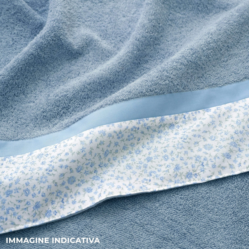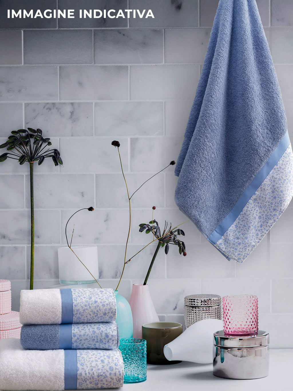 2 Gesichtstücher + 2 Gästetücher aus reinem Baumwollfrottee 430 g, verziert mit einer bedruckten Perkalrüsche. Alle Artikel des Sets werden in Italien nach toskanischer Textiltradition hergestellt und verpackt.