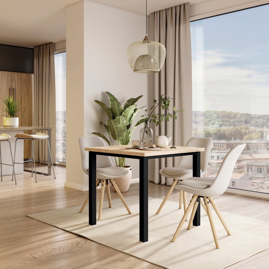 La struttura del tavolo con gambe a sezione quadrata è realizzata in acciaio e si abbina a tutti i tipi di mobili da cucina, casa e ufficio.