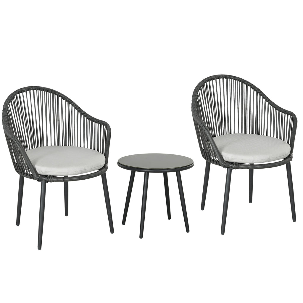 Set Tavolino da Caffè con Piano in Vetro e 2 poltroncine da Giardino in Rattan con Cuscini Grigio