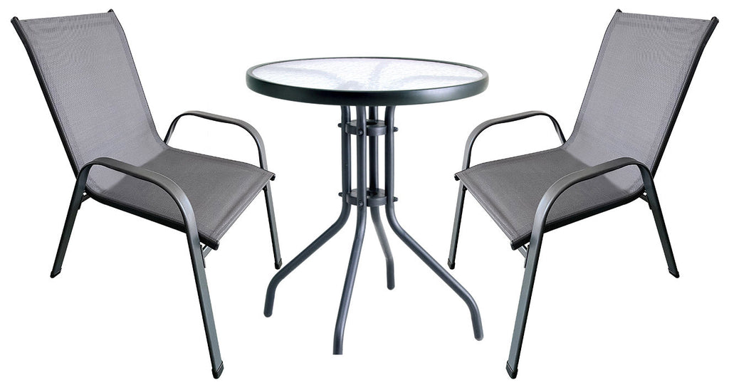 Set aus Couchtisch und 2 Gartenstühlen aus Stahl und dunkelgrauem Textilene