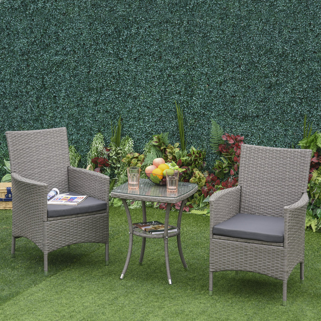 Schaffen Sie mit diesem Lounge-Set eine entspannende Ecke in Ihrem Garten! Das Set umfasst einen Tisch und zwei Gartenstühle aus synthetischem Rattan, einem eleganten und sehr widerstandsfähigen Material: perfekt für Außenbereiche. Der Rahmen der Möbel besteht aus Stahl und die Tischplatte aus gehärtetem Glas, für einen zusätzlichen Hauch von Eleganz.