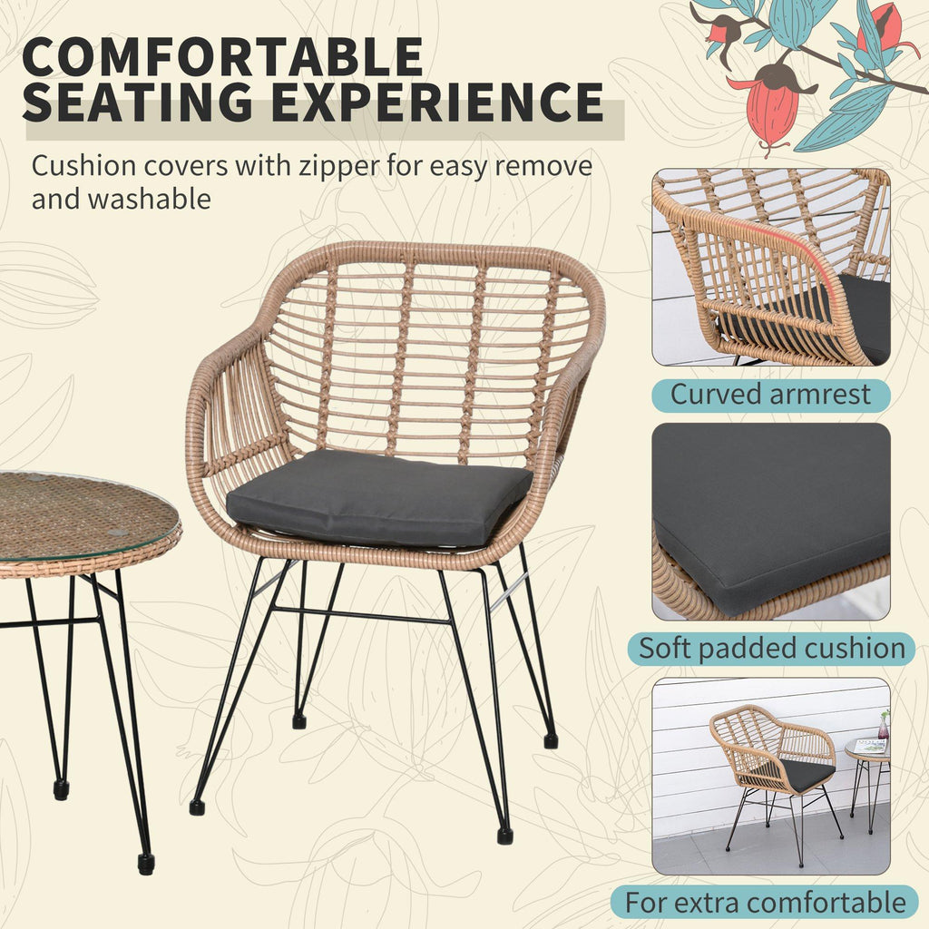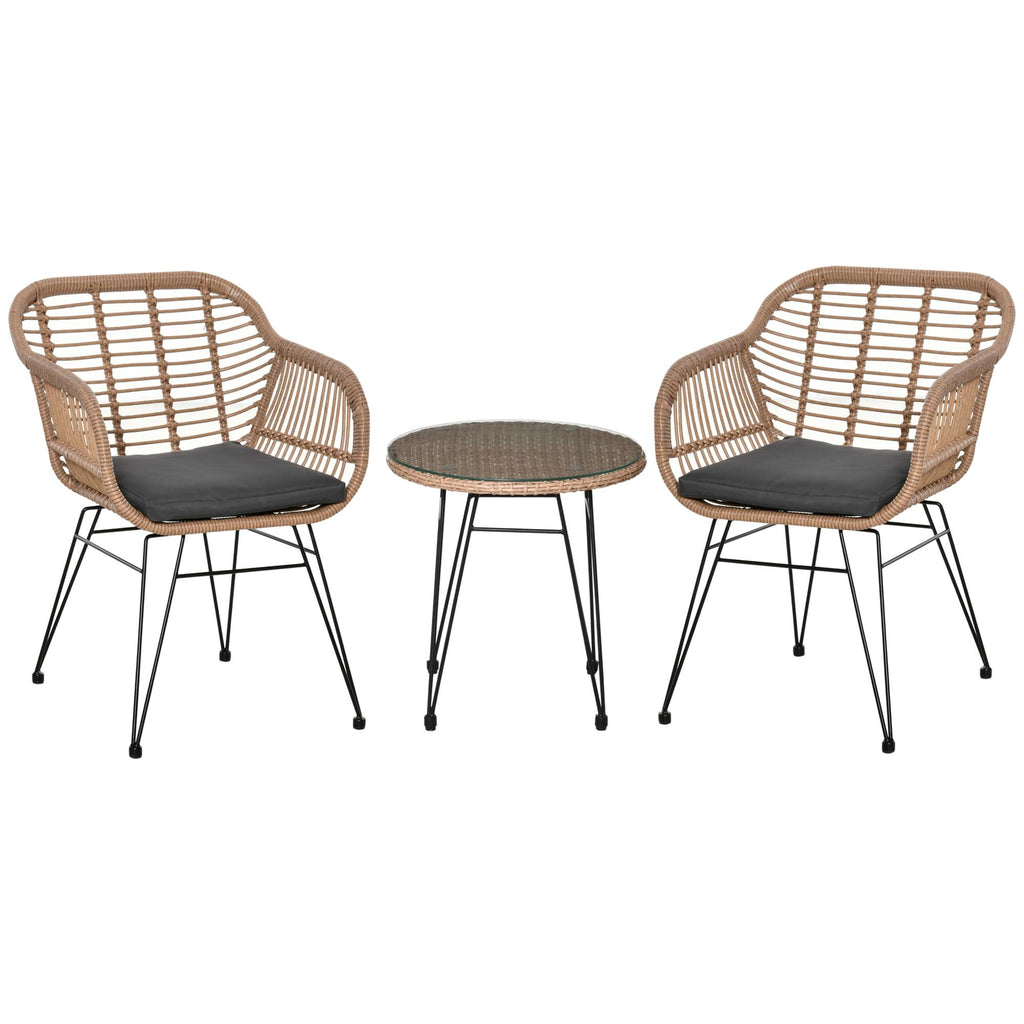 Dieses Gartenset aus PE-Rattan bietet dank seines stabilen Metallrahmens maximale Festigkeit. Das natürliche Aussehen des Rattans schafft einen Look, der sich gut für jede Umgebung eignet, ob drinnen oder draußen. Der Gartentisch hat eine Glasplatte, die leicht sauber zu halten ist, und die Outdoor-Stühle haben bequeme Kissen mit abnehmbaren Bezügen. Genießen Sie mit diesem Garten-Lounge-Set sofort Ihr Essen im Freien.