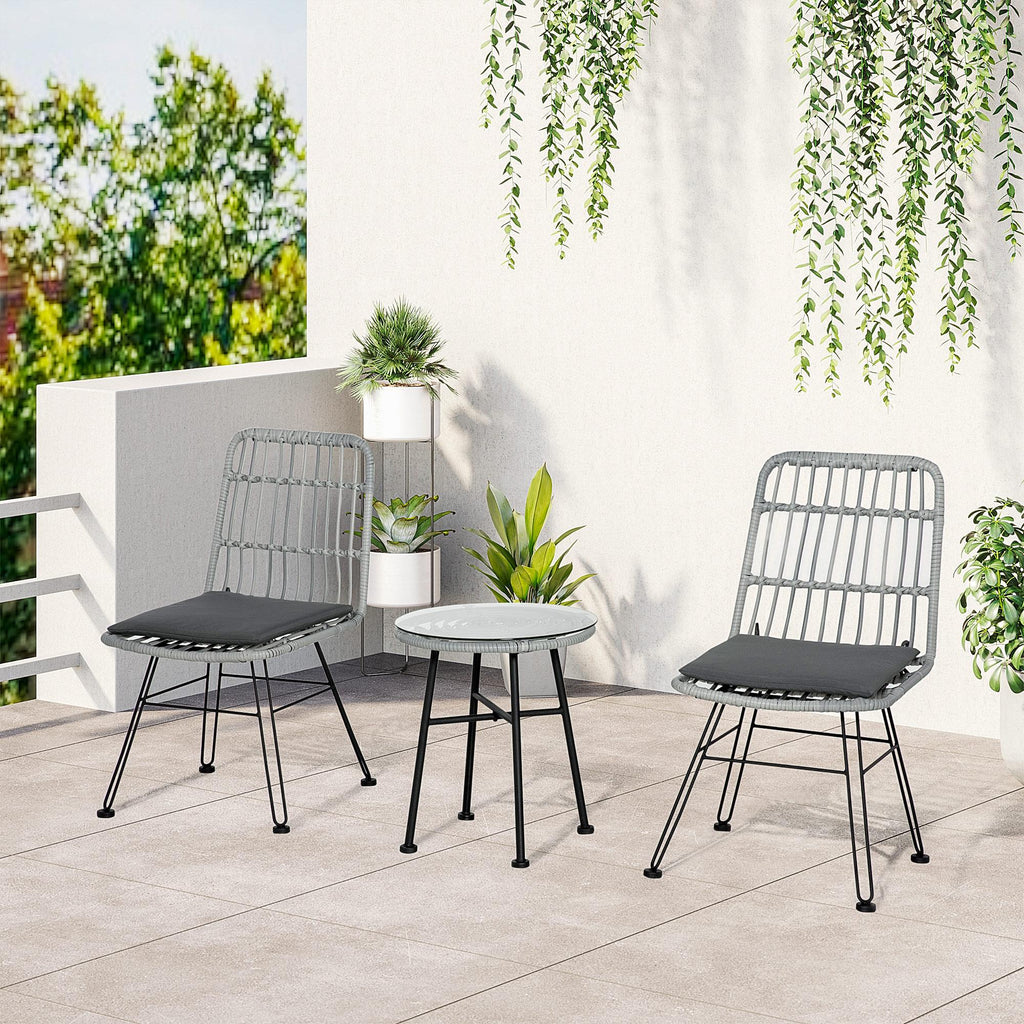 Das 3-teilige Outdoor-Bistro-Set aus PE-Rattan ist die ideale moderne Ergänzung für Ihren Außenbereich. Im Lieferumfang enthalten sind zwei Stühle und ein kleiner runder Tisch, der aus PE-Rattangeflecht mit einem robusten Stahlrahmen besteht. Die runde Tischplatte mit gehärteter Glasplatte ermöglicht eine einfache Reinigung mit einem feuchten Tuch, außerdem bietet dieses Set eine zuverlässige Langlebigkeit. Genießen Sie Ihre wohlverdiente Entspannung mit dem richtigen Set aus Gartentisch und Stühlen.