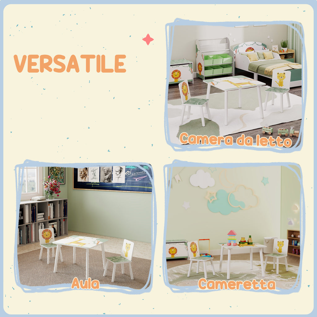 Set Tavolino e 2 Sedie per Bambini 3-8 Anni in MDF Fantasia con Animali Verde