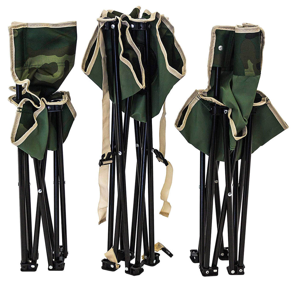 Rückenlehne und Sitzfläche sind für eine maximale Belastung von 100 kg geeignet. Der praktische Tragegriff der Tasche, ebenfalls mit Camouflage-Muster, ermöglicht es, das Set wie eine Aktentasche über der Schulter oder in der Hand zu tragen.