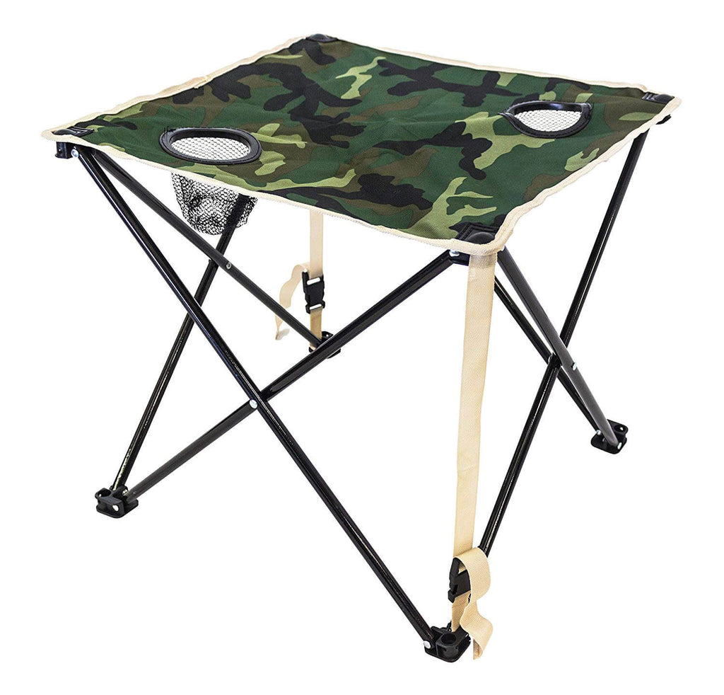 Das 600D-Camouflage-Oxford-Gewebe ist mit Wasser und Seife waschbar. Der Tisch ist mit 2 praktischen Netztaschen zum Einstecken von Gläsern, Dosen und Flaschen ausgestattet.