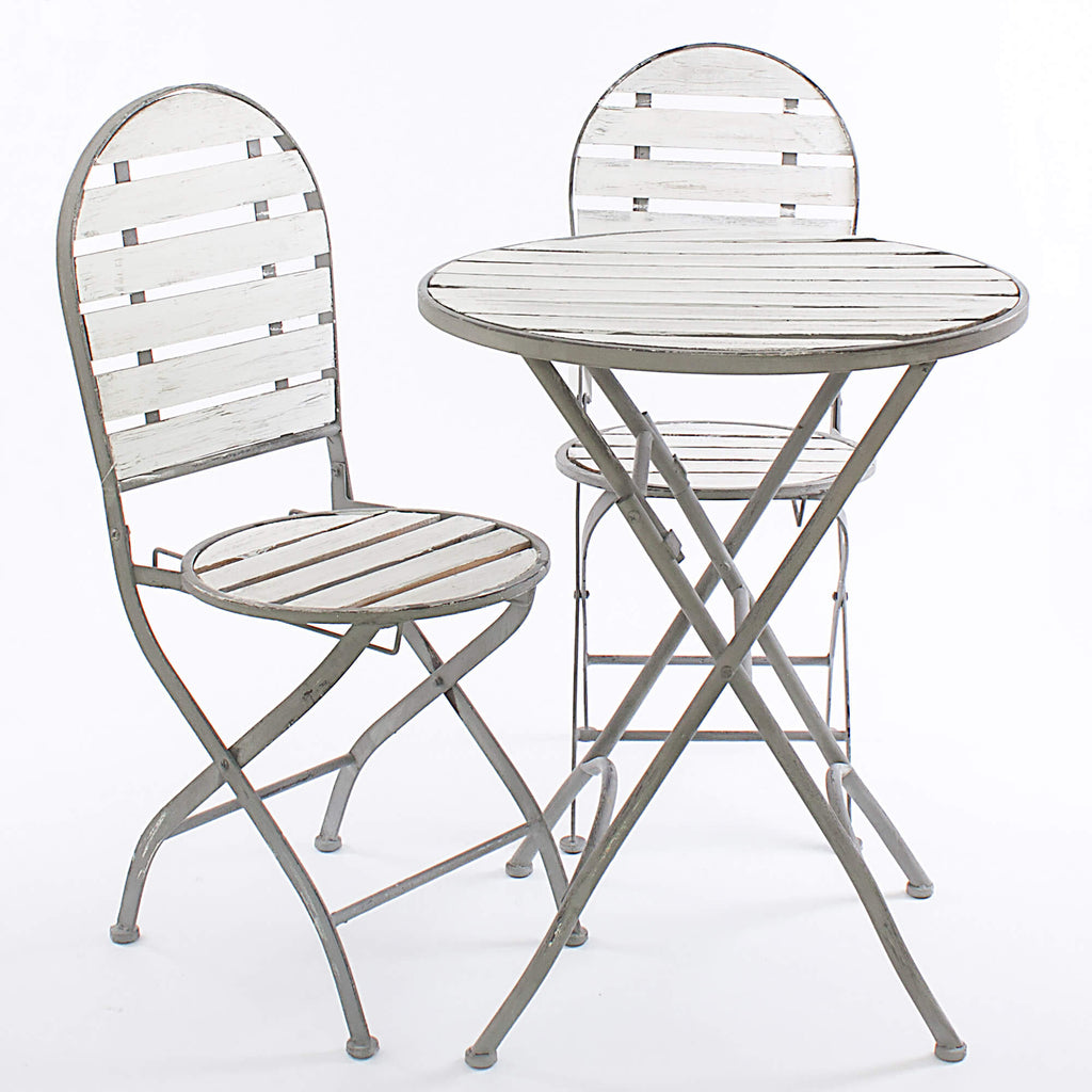 Set composto da un tavolo rotondo e due sedie in abete e metallo. Tutti i prodotti del set sono pieghevoli. Adatto per uso esterno: tenere al riparo dalle intemperie.