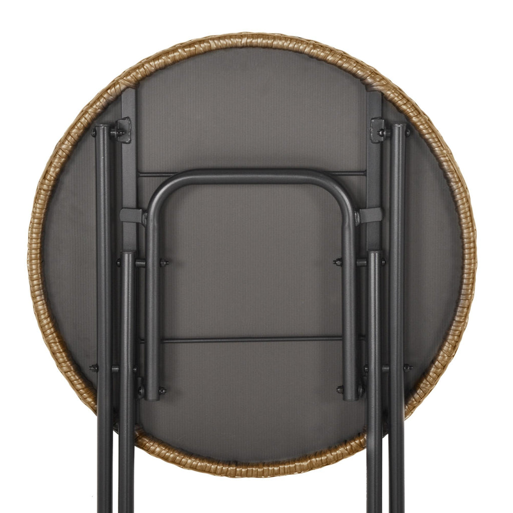 Das 3-teilige Gartentisch- und Stuhlset verbindet elegantes Design mit Funktionalität. Sie sind aus hochwertigem PE-Rattan gefertigt und haben einen soliden Stahlrahmen, der witterungsbeständig und langlebig ist. Das Rattan und das Design der Rückenlehne der klappbaren Gartenstühle verleihen einen Retro-Stil, der sich perfekt zur Dekoration jedes Raums eignet. Leicht zu reinigen und zu pflegen, ist es die perfekte Wahl, um mit Freunden oder Ihrem Partner einen Drink im Freien zu genießen!