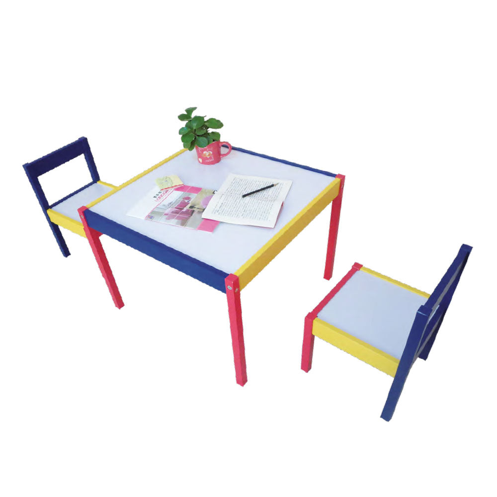 Das Regenbogen-Set aus Tisch und Stühlen mit erhöhten Kanten zum Halten von Gegenständen und einer abwischbaren Zeichenfläche.