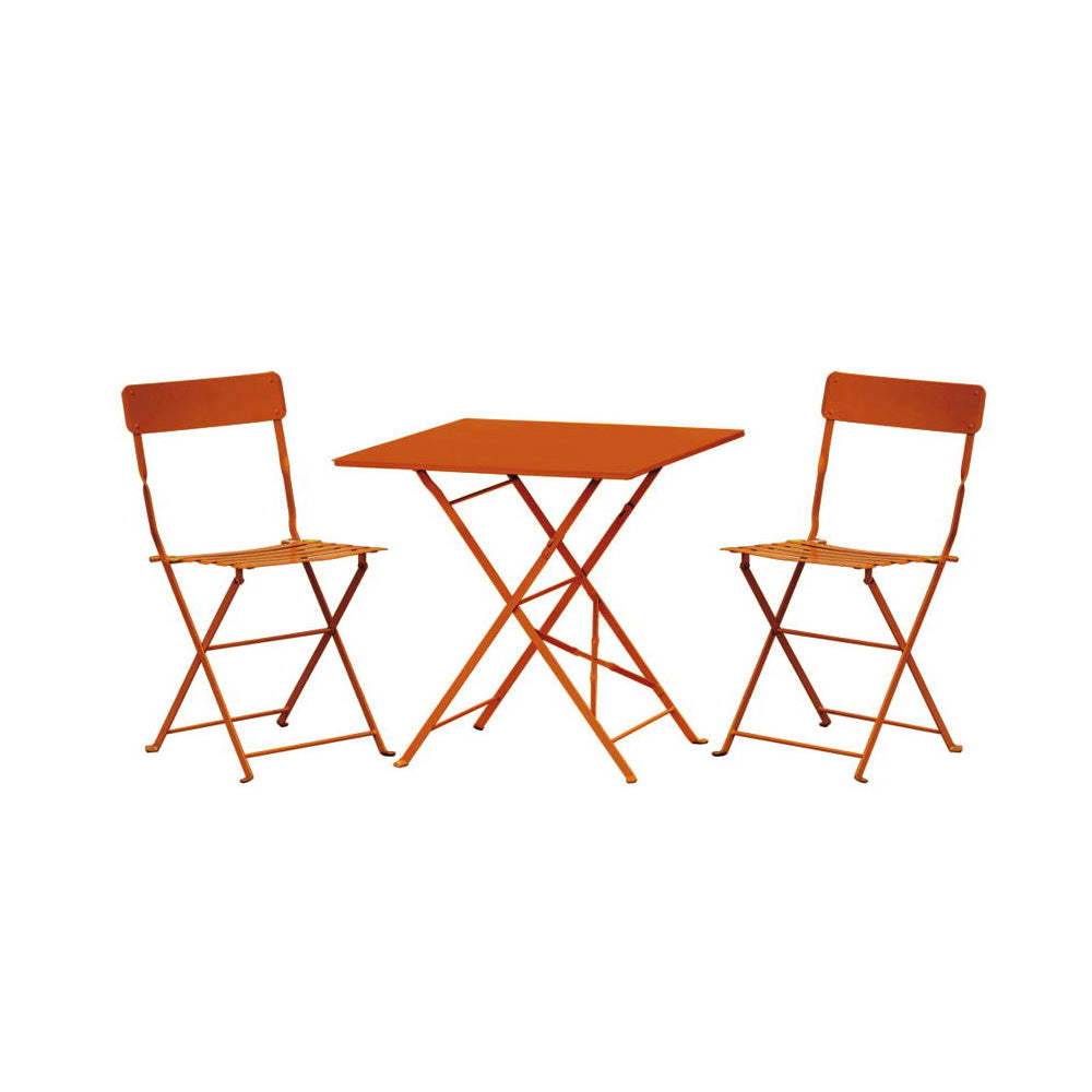 Orangefarbenes klappbares Wohnzimmer (1 Tisch 2 Stühle) aus Stahl - Farbe Orange - Tisch 70x70x70h cm - Stuhl 33x44x82h cm.Gedeckter Tisch + 2 Klappstühle in Orange Stahl Wohnzimmer Orange