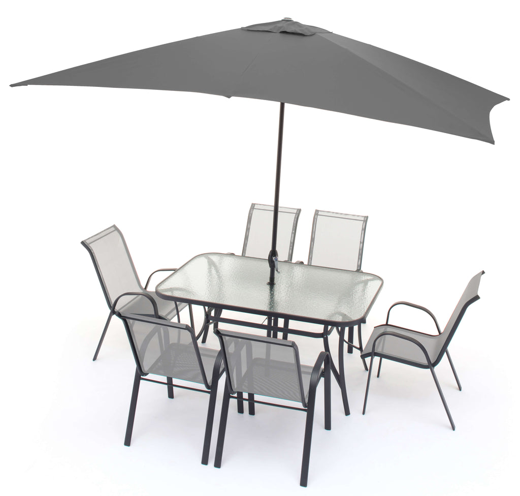 Tisch, Stühle und Schirmstruktur aus anthrazitgrau pulverbeschichtetem Eisen.
