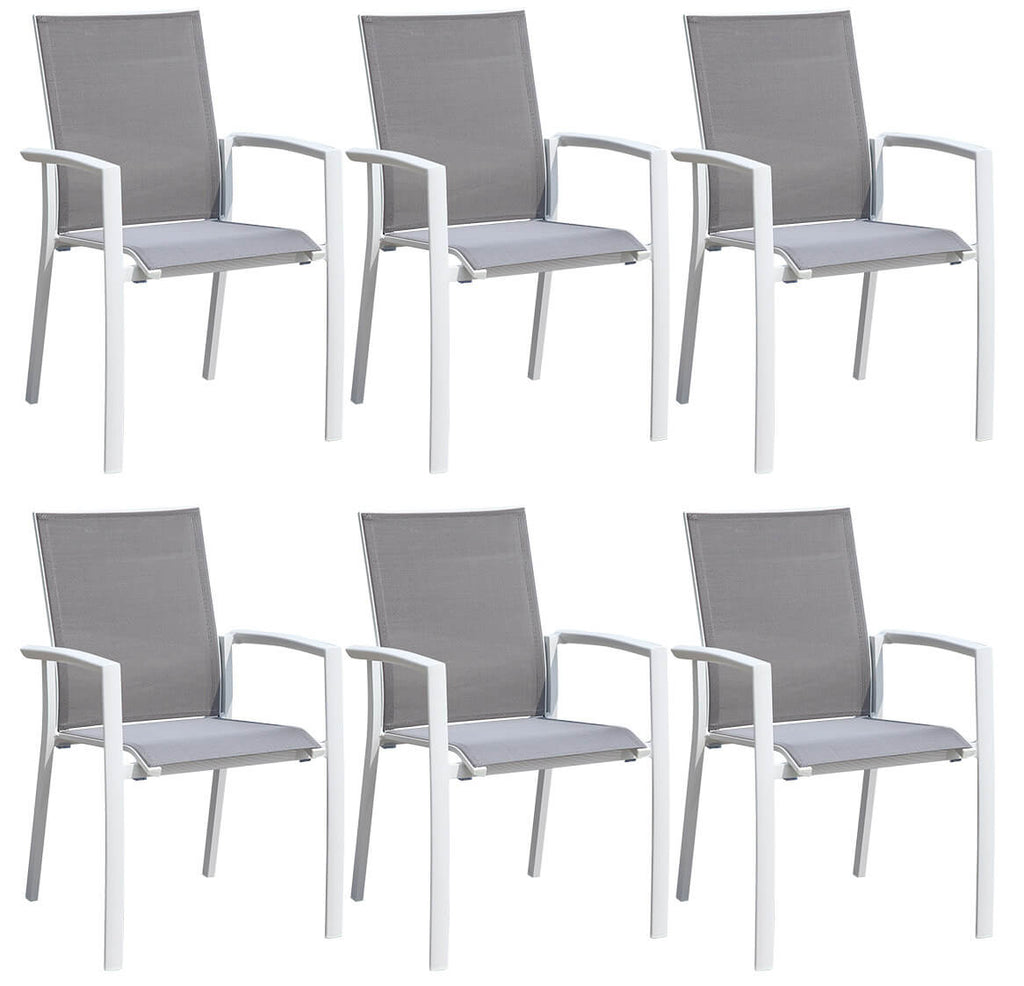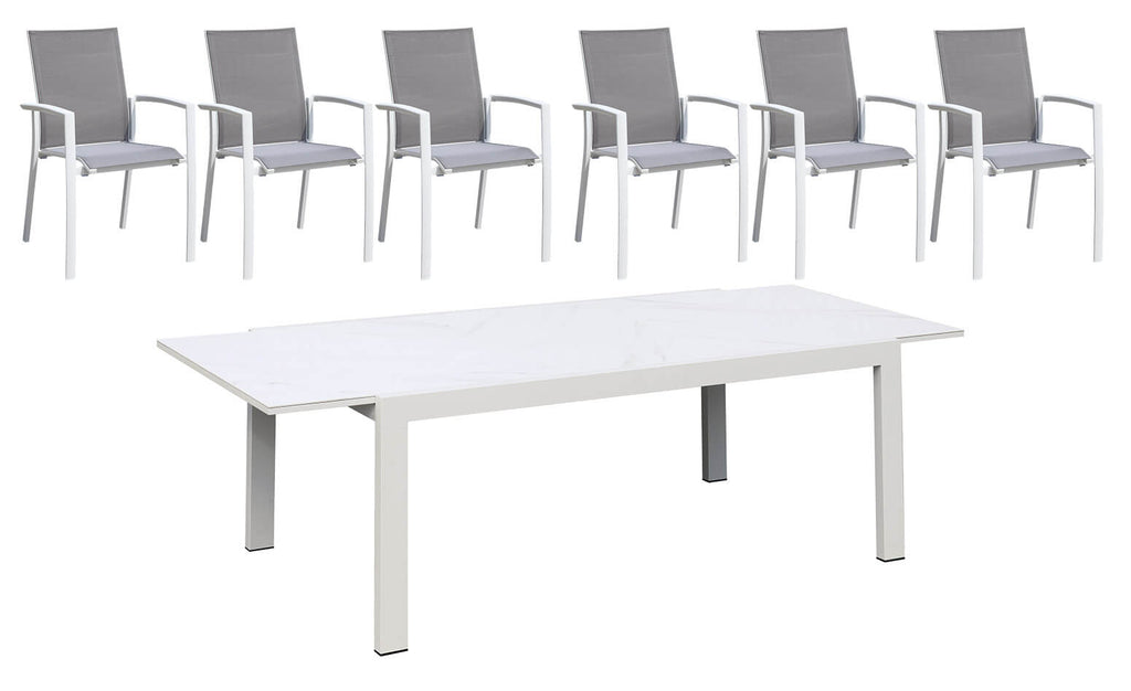 Set aus ausziehbarem Tisch und 6 Gartenstühlen aus Aluminium und weißem Textilene