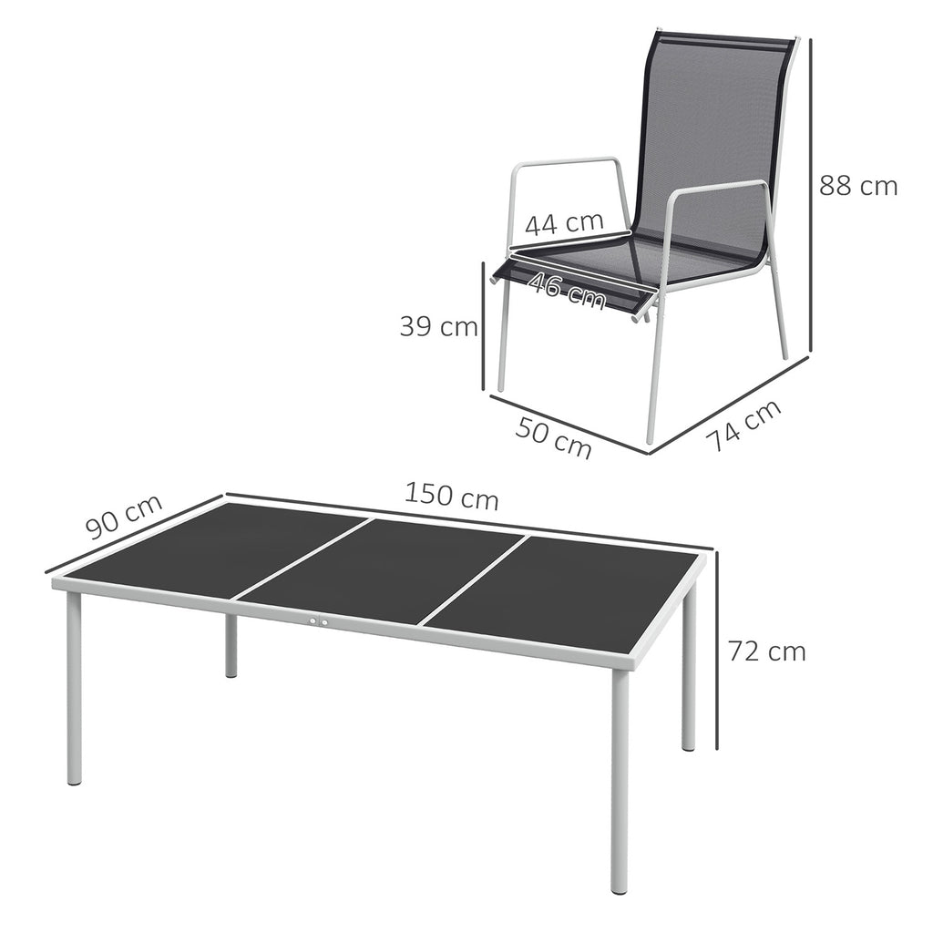 Questo set da esterno è l'ideale per godersi pasti all'aria aperta con amici e familiari. Comprende un tavolo con piano in vetro temperato e sei sedie impilabili con seduta in textilene. Ogni pezzo è realizzato con una struttura in acciaio verniciato a polvere, resistente e perfetta per l'uso esterno. È la soluzione ottimale per dare stile e praticità al tuo spazio all'aperto!