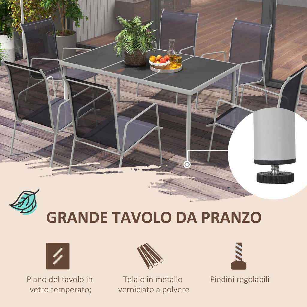 Set Tavolo con Top in Vetro 6 Sedie Impilabili da Giardino in Acciaio e Textilene Nero