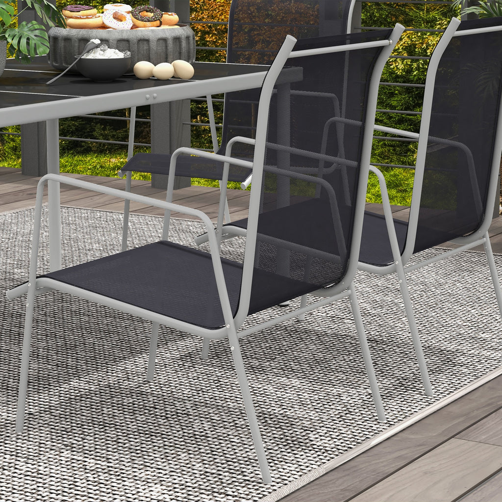 - SEDIE IMPILABILI: Le sedie da giardino sono dotate di braccioli e di una comoda seduta in texteline traspirante, impermeabile e facile da pulire. Grazie al loro design, puoi comodamente impilarle per occupare il minor spazio possibile quando non le usi