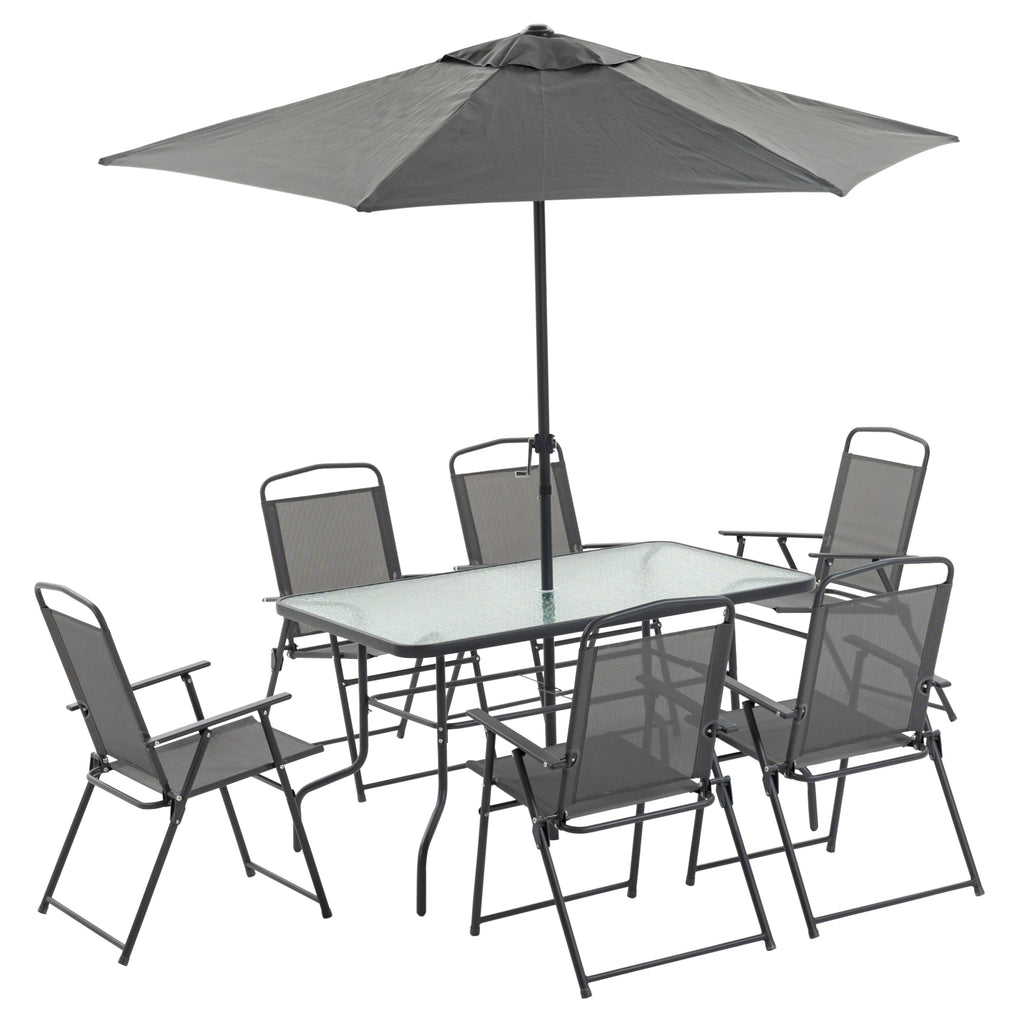 - 8-teiliges Set: 6 Stühle, 1 passender Tisch und 1 Sonnenschirm