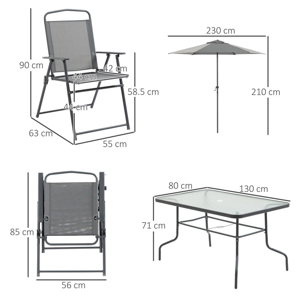 Set aus Tisch und 6 klappbaren Gartenstühlen mit Sonnenschirm mit Glasplatte und grauen Stoffsitzen
