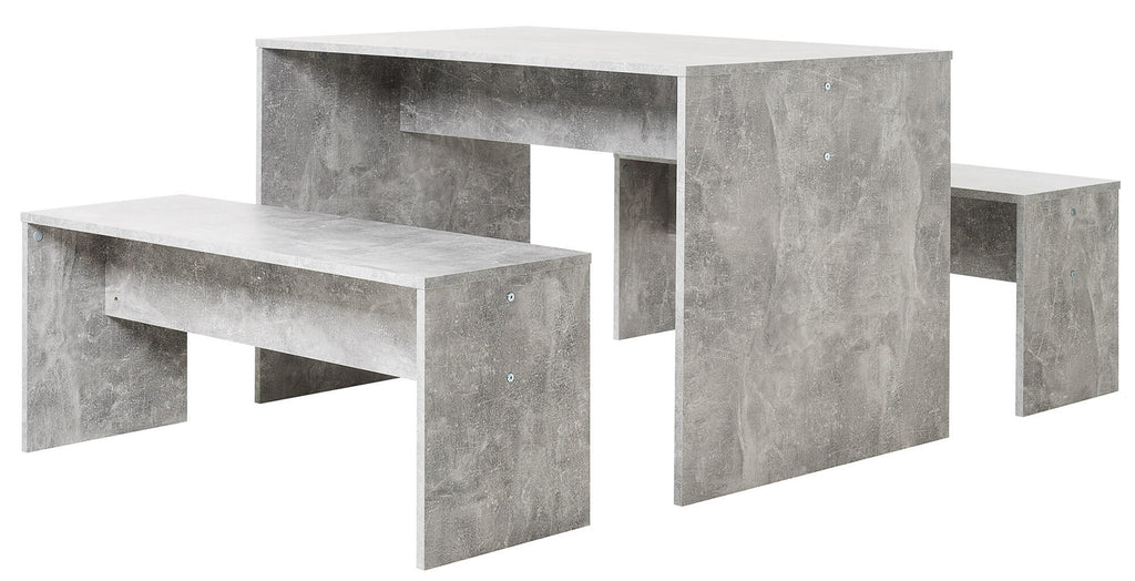 Tisch und 2 Bänke aus Spanplatten mit zementfarbenem Melamin. Die Bänke können bei Nichtgebrauch unter den Tisch geschoben werden. Das sehr praktische und in Deutschland hergestellte Baviera-Set eignet sich für den Einsatz in Kontexten, in denen der Platzbedarf auf zeitgenössischen Stil trifft, aber mit einem einfachen und funktionalen Design.