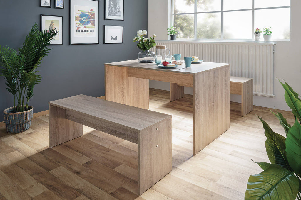 Tisch und 2 Bänke aus Spanplatte mit Melaminbeschichtung in Eichenfarbe. Die Bänke können bei Nichtgebrauch unter den Tisch geschoben werden. Das sehr praktische und in Deutschland hergestellte Baviera-Set eignet sich für den Einsatz in Kontexten, in denen der Platzbedarf auf zeitgenössischen Stil trifft, aber mit einem einfachen und funktionalen Design.
