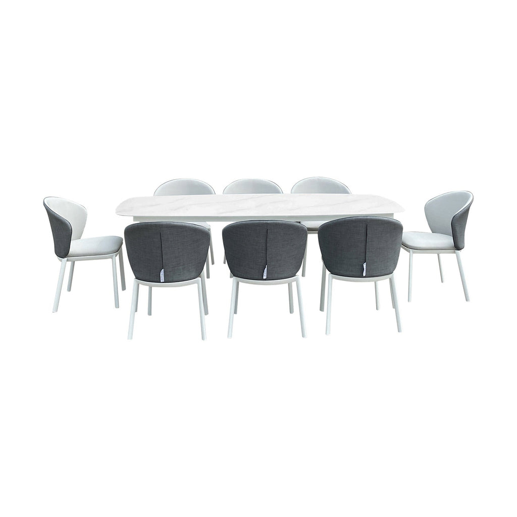 Immagina un set da giardino con tavolo rettangolare e sei sedie. Il tavolo ha una struttura in alluminio bianco opaco con piano in pietra sintetica bianca, mentre le sedie sono in alluminio bianco con tessuto textilene imbottito grigio chiaro. Un insieme elegante e funzionale per gli spazi all'aperto.