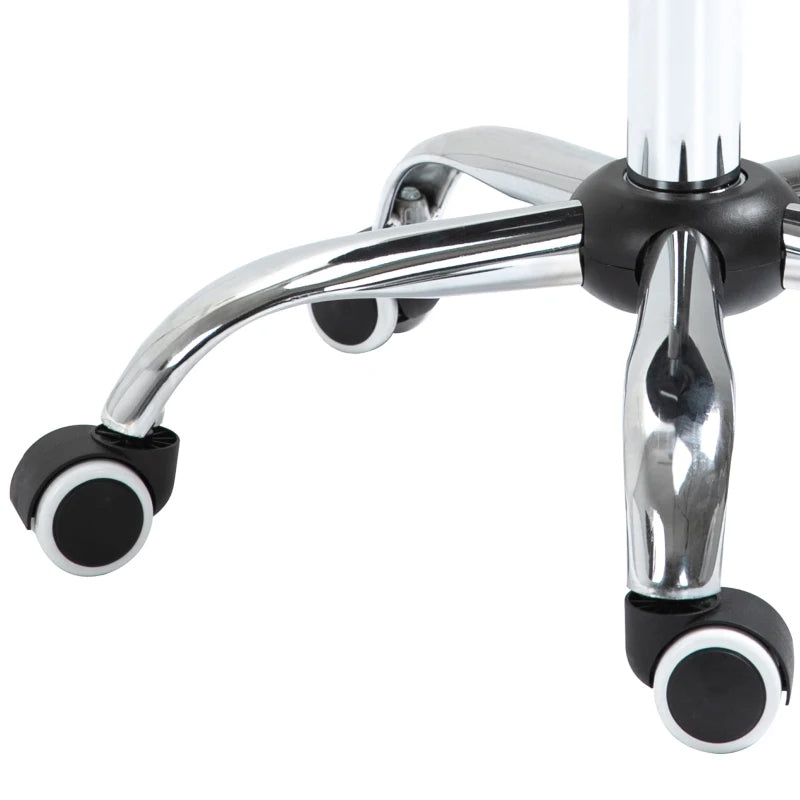 Hocker mit fünf Schwenkrädern und Sattelsitz, der problemlos in jeden Friseur, Schönheitssalon oder Tattoo-Shop passt.