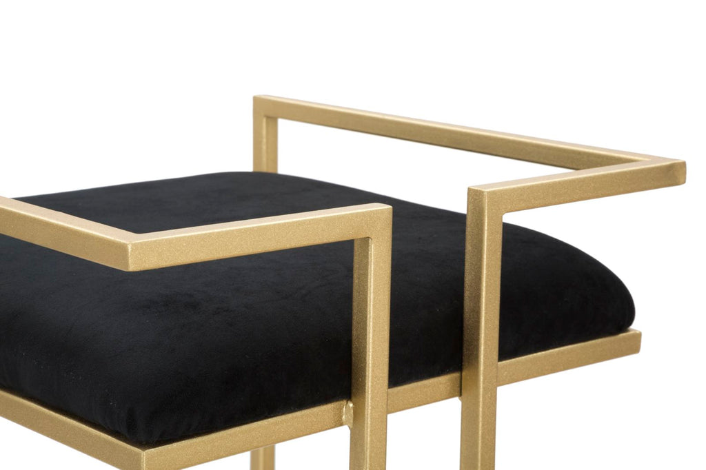 Eleganter Hocker aus vergoldetem Metall mit schwarzem gepolstertem Stoff mit quadratischen und geometrischen Linien. Goldenes Metall und schwarzer Samt verschmelzen zu einem einzigartigen Stil und verleihen jedem Raum Glamour.
