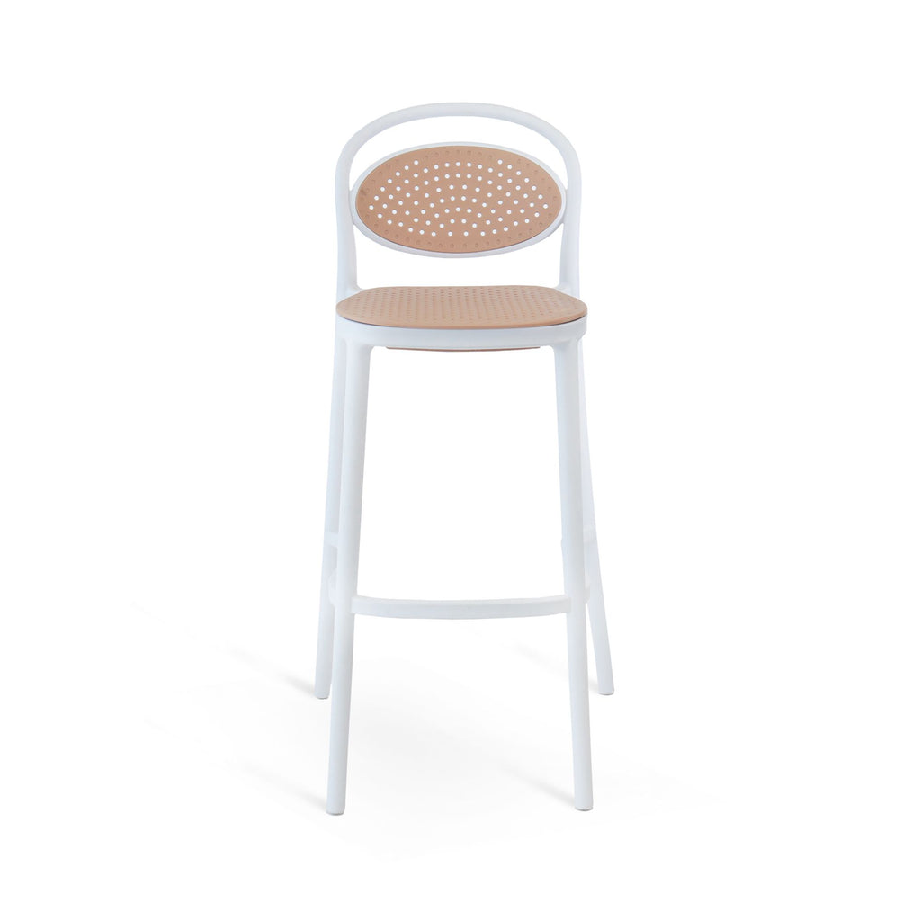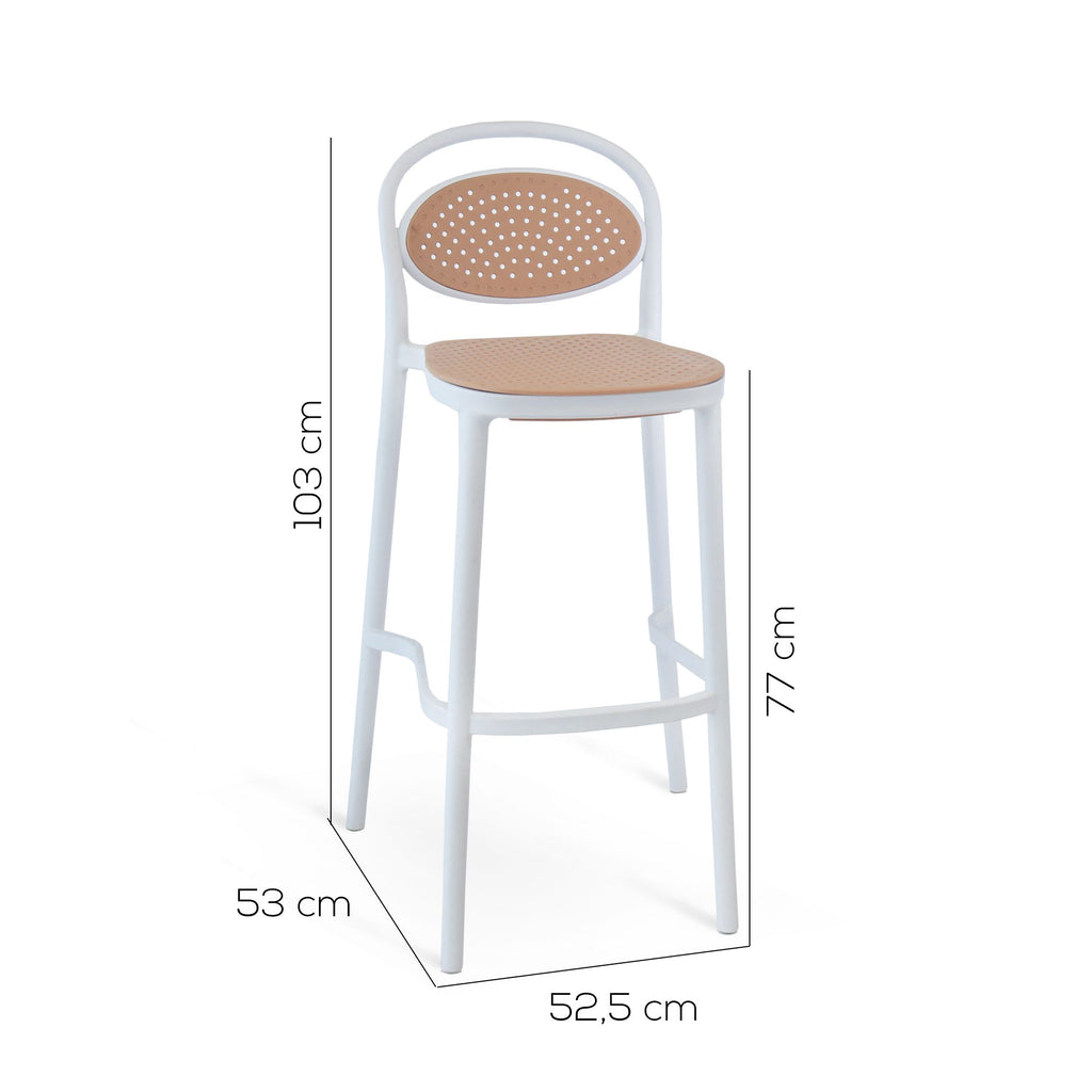 Il design dello sgabello Cosette ricorda quello delle eleganti e classiche sedie, ma reinventato con un materiale moderno e versatile, il polipropilene. Il contrasto di colori tra il beige dello schienale e della seduta, entrambi leggermente forellati, e il bianco della struttura dona allo sgabello un carattere deciso e particolare. Ideale per uso sia all'interno che all'esterno, è perfetta per arredare una cucina o un living, oppure un patio o un locale. Scheda Tecnica Sedia in polipropilene Dimensioni 52,5 x 53 x 103 cm