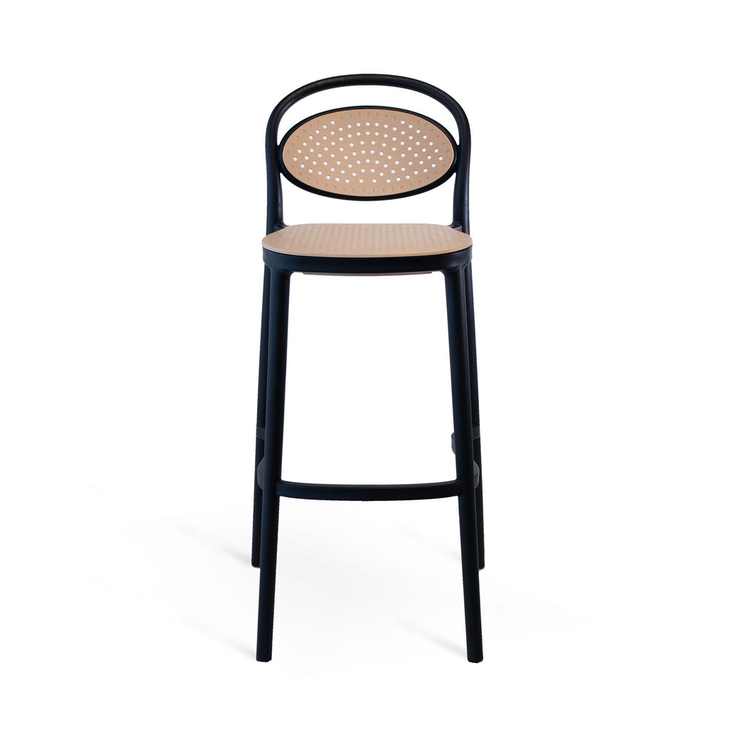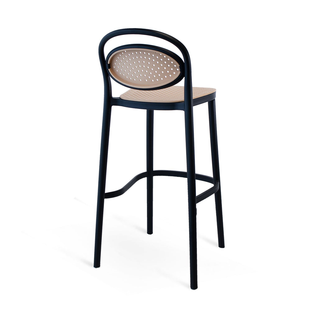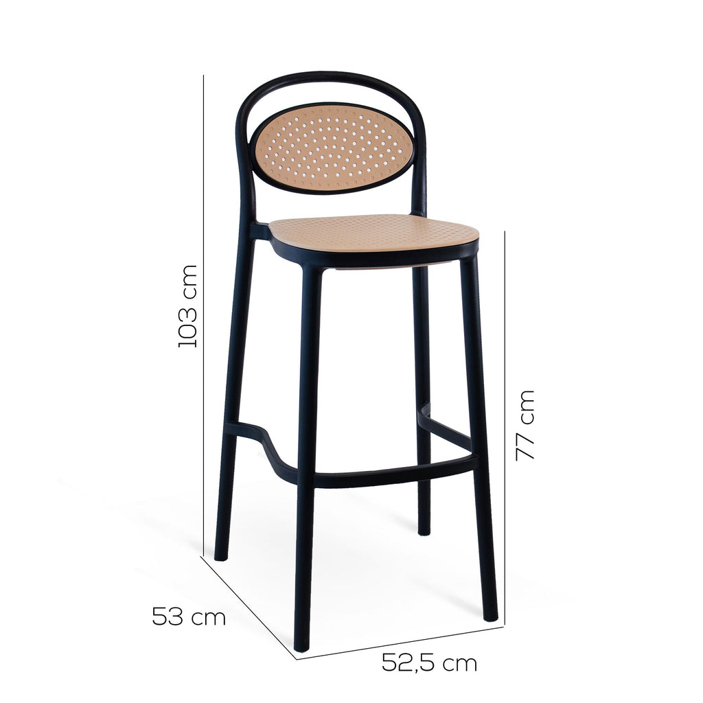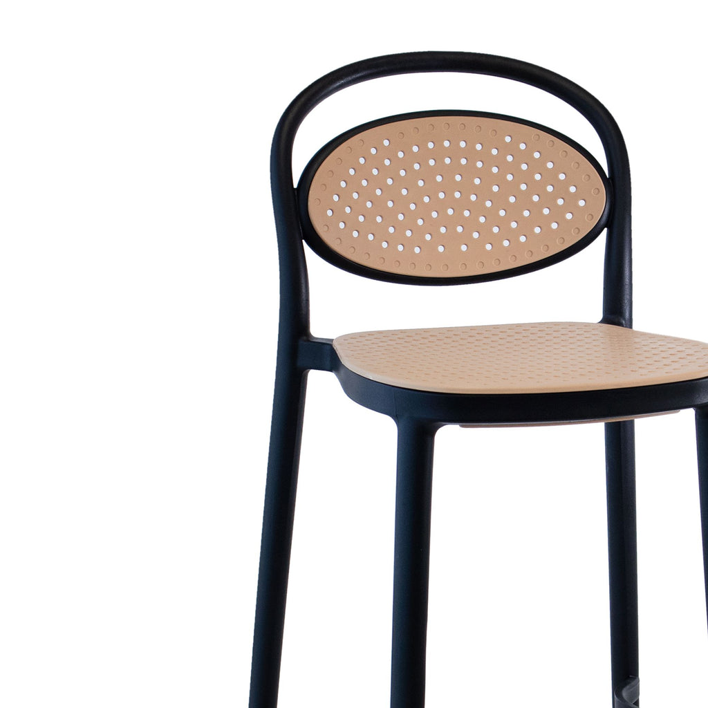 Il design dello sgabello cosette ricorda quello delle eleganti e classiche sedie, ma reinventato con un materiale moderno e versatile, il polipropilene. Il contrasto di colori tra il beige dello schienale e della seduta, entrambi leggermente forellati, e il nero della struttura dona allo sgabello un carattere deciso e particolare. Ideale per uso sia all'interno che all'esterno, è perfetta per arredare una cucina o un living, oppure un patio o un locale. Scheda Tecnica Sedia in polipropilene Dimensioni 52,5 x 53 x 103 cm