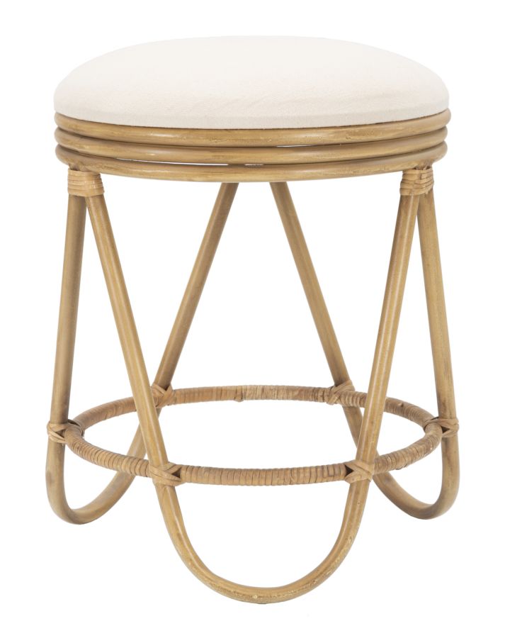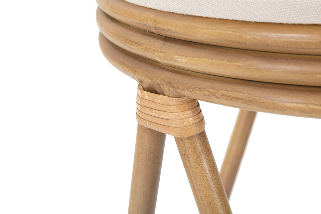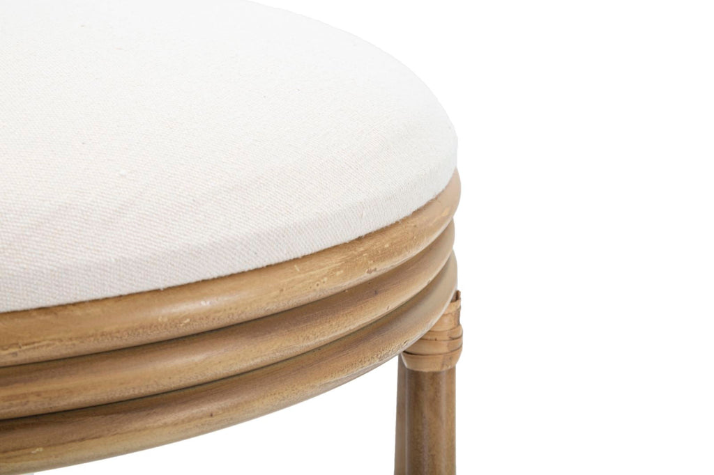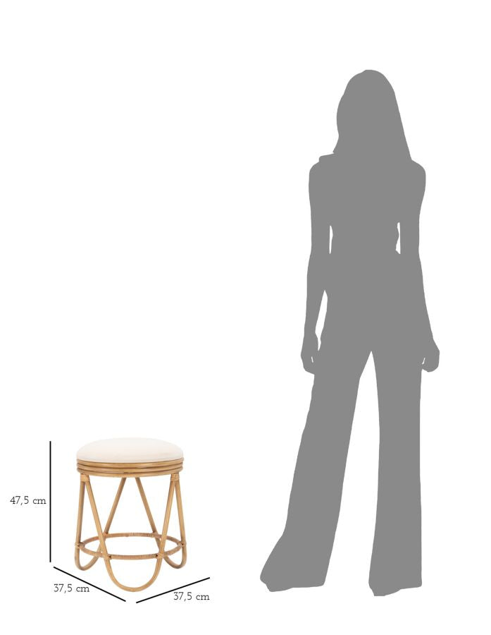 Questo sgabello apporta un tocco contemporaneo e accogliente a qualsiasi ambiente. Il suo design rotondo e le finiture in rattan aggiungono un tocco di rusticità ed eleganza. La seduta imbottita in tessuto bianco offre comfort e morbidezza, mentre le linee arrotondate conferiscono un aspetto moderno e invitante. Perfetto per essere utilizzato intorno a un tavolo da pranzo o come elemento decorativo in un angolo della stanza.