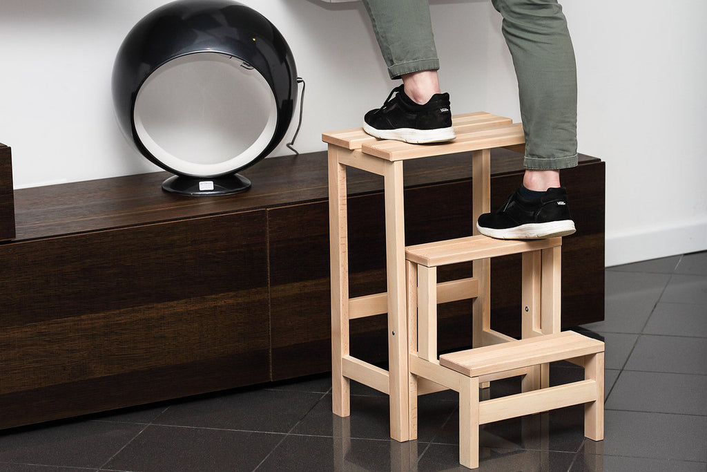 Zuverlässig, sicher, unverzichtbar mit einer Prise Eleganz und Fröhlichkeit. Praktischer Hocker aus massiver Buche: Dank der zwei drehbaren Stufen kann er bei Bedarf als solide Leiter verwendet werden. Besonders praktisch für den Zugriff auf die oberen Regale von Kleiderschränken und Bücherregalen oder zum Sitzen auf der Halbinsel in der Küche wie auf einem normalen Einrichtungshocker. Die Oberseite hat horizontale rutschfeste Rillen. Die Färbung der Oberfläche erfolgt mit natürlichen Farben auf Wasserbasis, die mit zwei Schichten undurchsichtigem Acryllack beschichtet sind: Der Acryllack garantiert eine hervorragende Kratzfestigkeit und bewahrt die Farben vor Farbveränderungen durch Zeit und Licht. Diese Holzleiter ist nach der europäischen Norm UNI EN131 geprüft