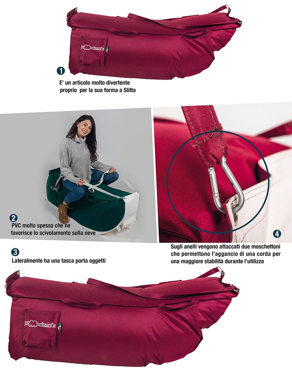Als „weiche Alternative“ zu den bekannten und klassischen Schneeschlitten geboren, kombiniert Slittone die Sicherheit eines Schlittens aus ultra-widerstandsfähigem Stoff mit dem Spaß eines der ersten Spiele, das für Spaß im Schnee in jedem Alter entwickelt und gebaut wurde , der Schlitten.