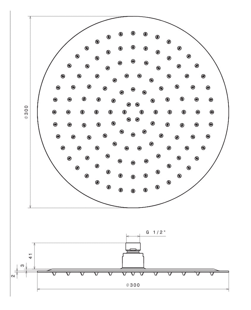 Ultraschlanker runder Duschkopf aus Edelstahl mit Regenstrahl und 300 mm Durchmesser. Wassereinsparung, essentielles Design, rein italienische Vision. Für Duschen geeignet.