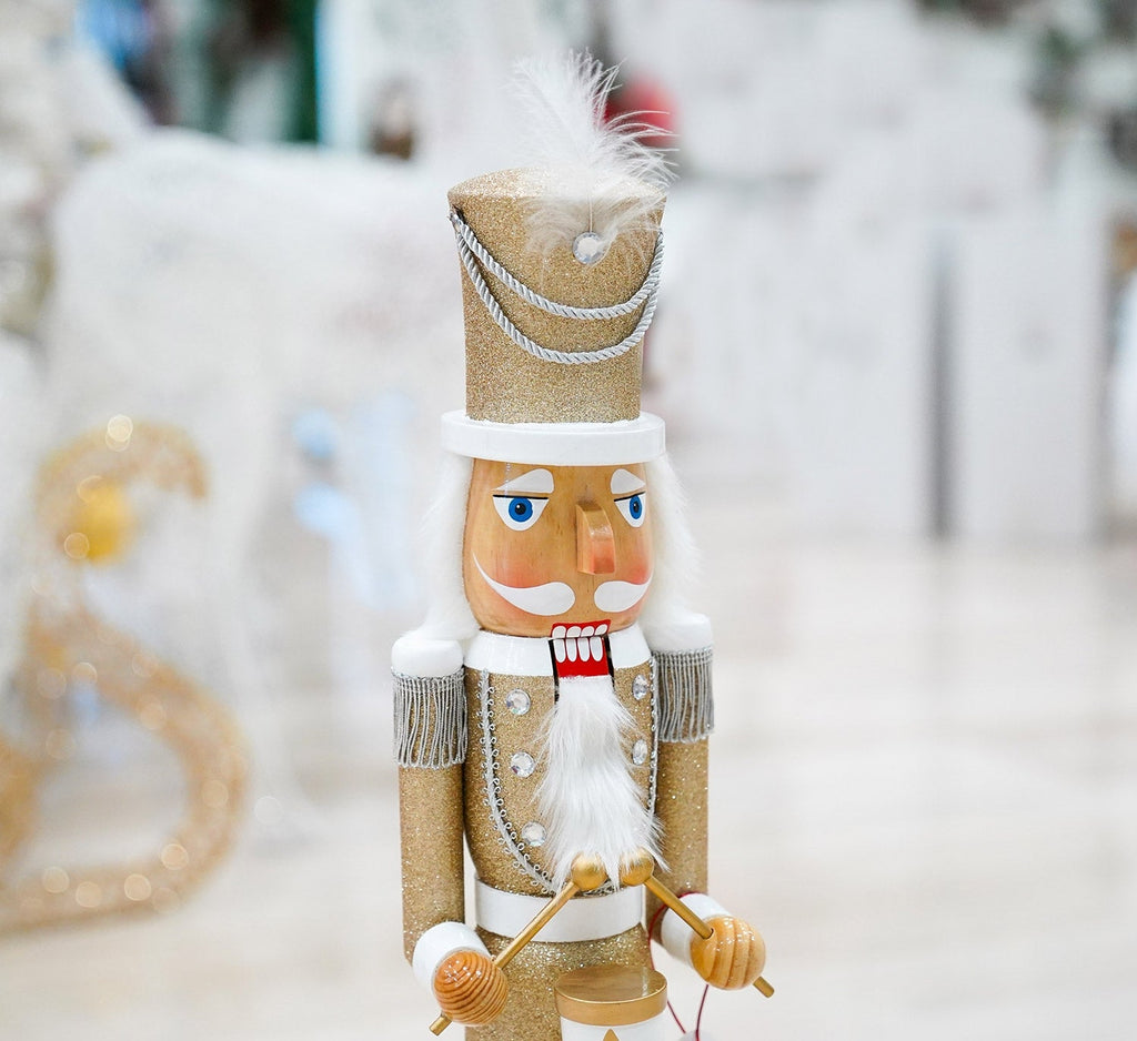 Weihnachtlicher Nussknacker aus Holz, handbemalt mit Goldglitter und Trommel.