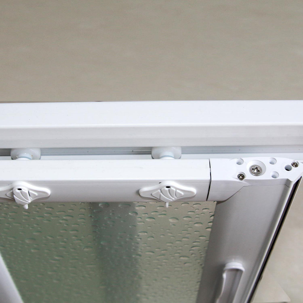 Reduzierbar, an der Schiebetür angebrachte Vorrichtung zum Einstellen des Schiebers bei falscher Rechtwinkligkeit, reversibel, kombinierbar mit festen Wänden, ausgestattet mit Magnetverschluss, Anti-Kalkstein, Anti-Korrosion.