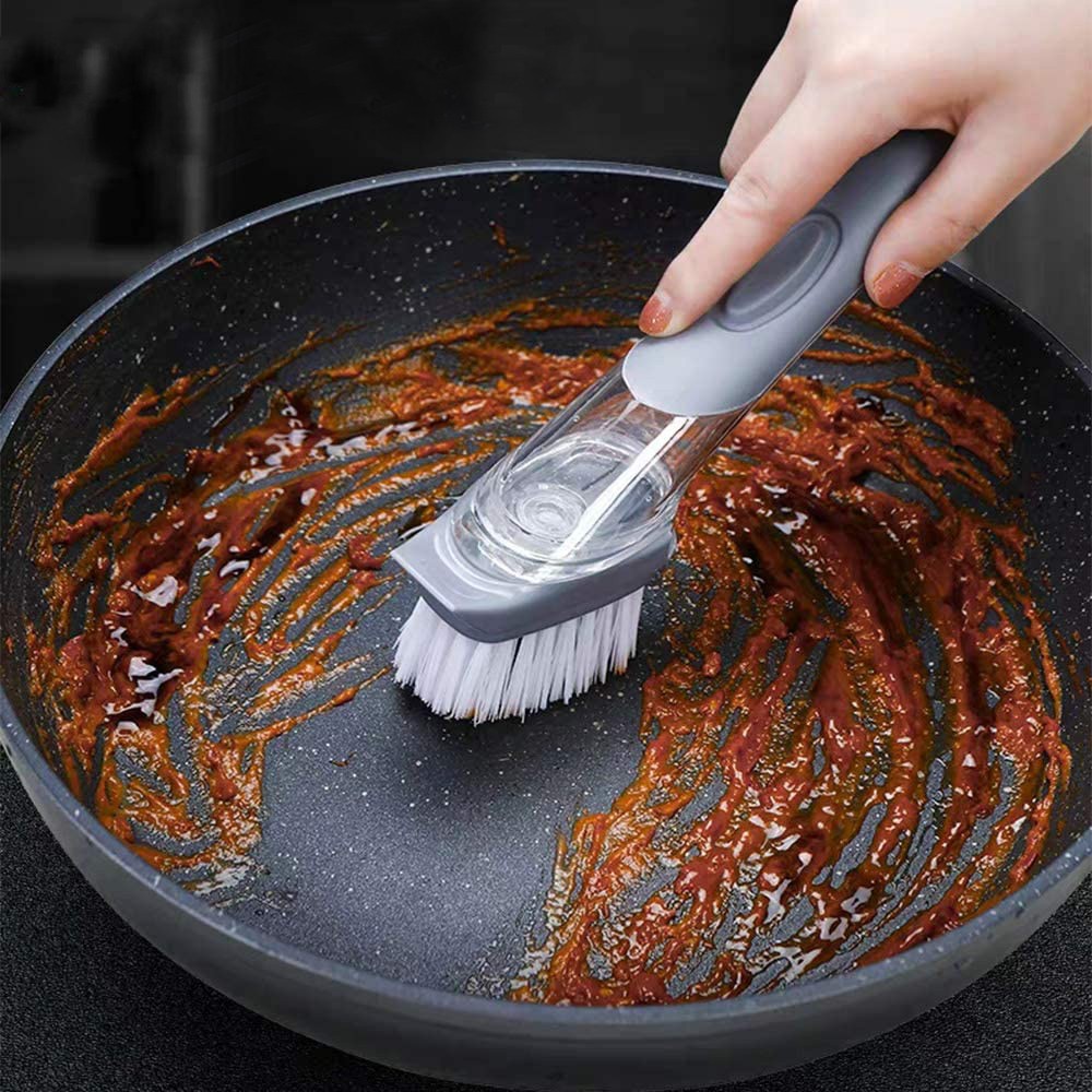 Ein wertvoller Verbündeter für die Reinigung von Geschirr: Mit der praktischen Bürste mit integriertem Seifenspender können Sie Geschirr und Pfannen ganz einfach schrubben.