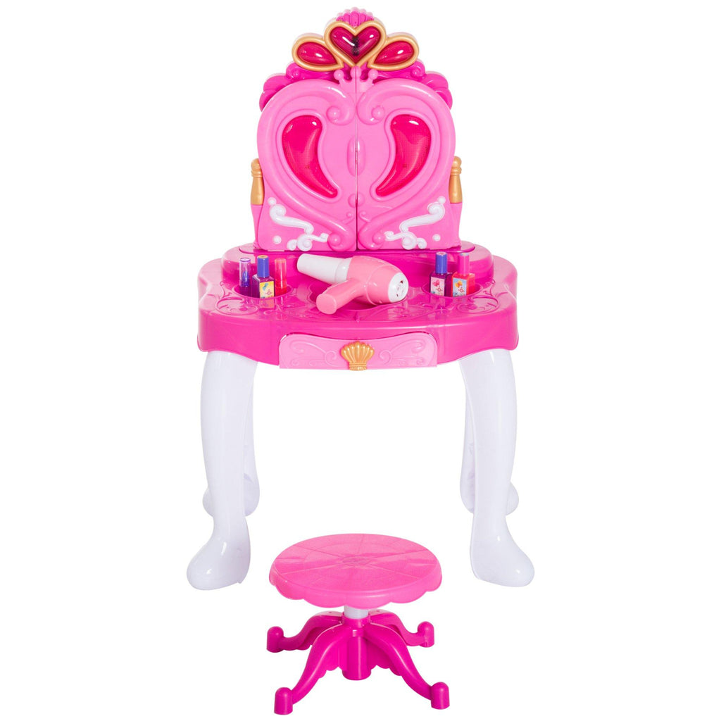 Dieses Schminkset für Mädchen besteht aus einem Tisch, einem Hocker, einem Spiegel und viel Zubehör.