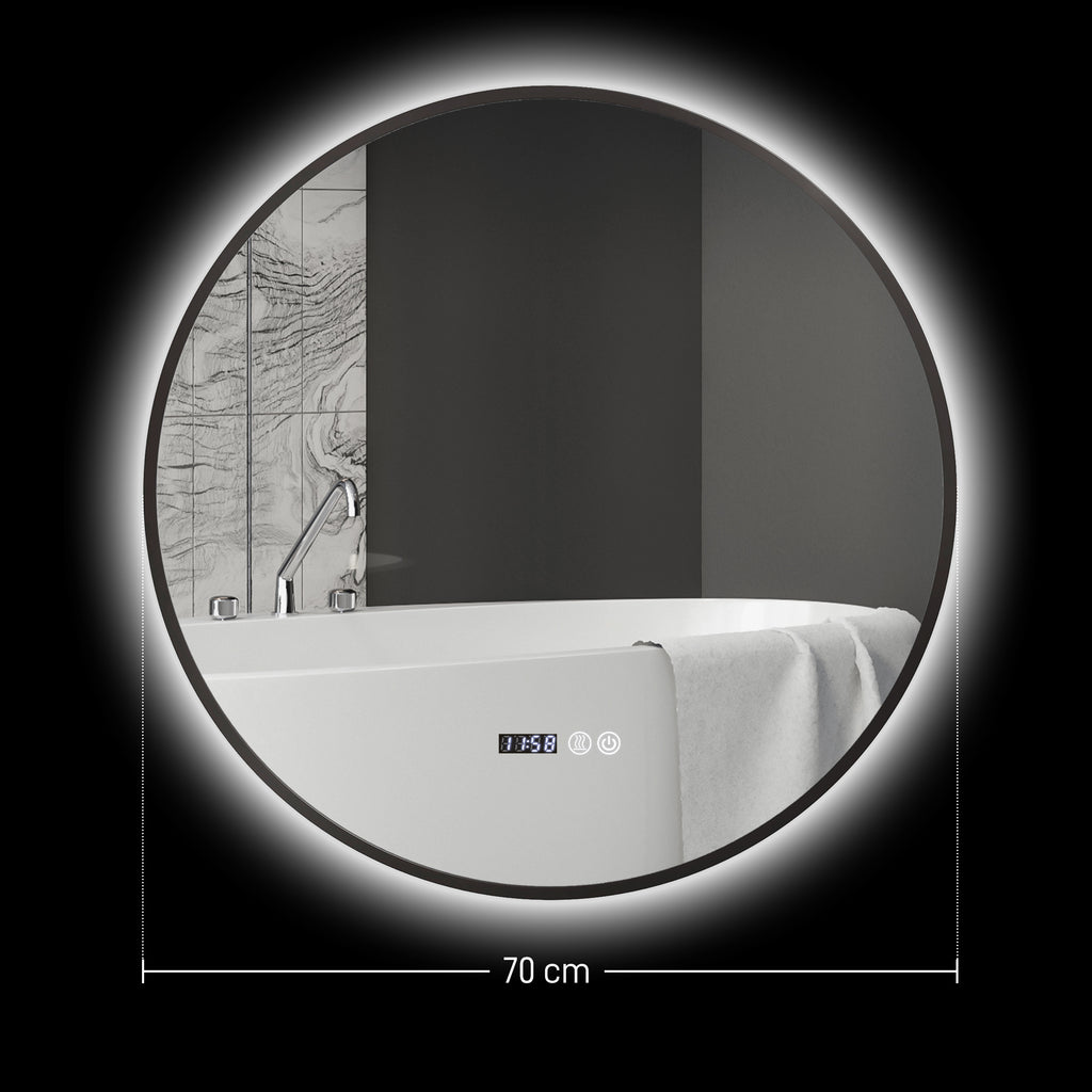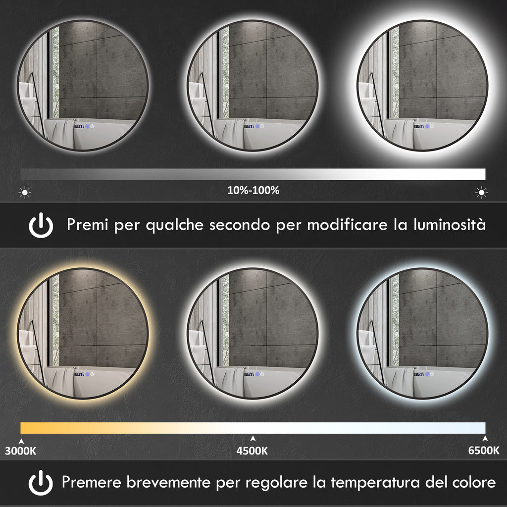 Specchio Bagno con Luce LED a 3 Tonalità Ø70 cm Antiappannamento e Display Tempo e Temperatura Nero