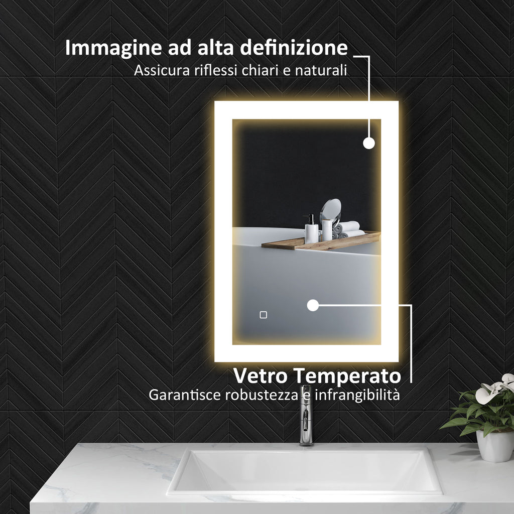 Trasforma il tuo bagno con questo specchio illuminato a LED, funzionale e sicuro per qualsiasi ambiente moderno. Lo specchio presenta luce e tonalità regolabili: bianco caldo (3000K), naturale (4500K) e freddo (6500K),mentre la funzione memory ricorda le impostazioni precedenti e spegne l'indicatore di alimentazione attraverso una semplice una pressione prolungata. Rinnova lo spazio con la presenza costante di un riflesso di qualità. Specchio da bagno con luminosità regolabile e tre temperature di colore per ottenere la propria luce preferita. Lo specchio illuminato memorizza le ultime impostazioni per maggiore comodità. La funzione anti-appannamento mantiene lo specchio moderno chiaro dopo la doccia. Grado di impermeabilità IP44 adatta per bagni umidi. Specchio per bagno con riflesso chiaro e vetro temperato infrangibile. Cornice in lega di alluminio elegante per un tocco di modernità e sicurezza. Montaggio a parete verticale o orizzontale con accessori inclusi. È necessaria l'installazione cablata (spina non inclusa).