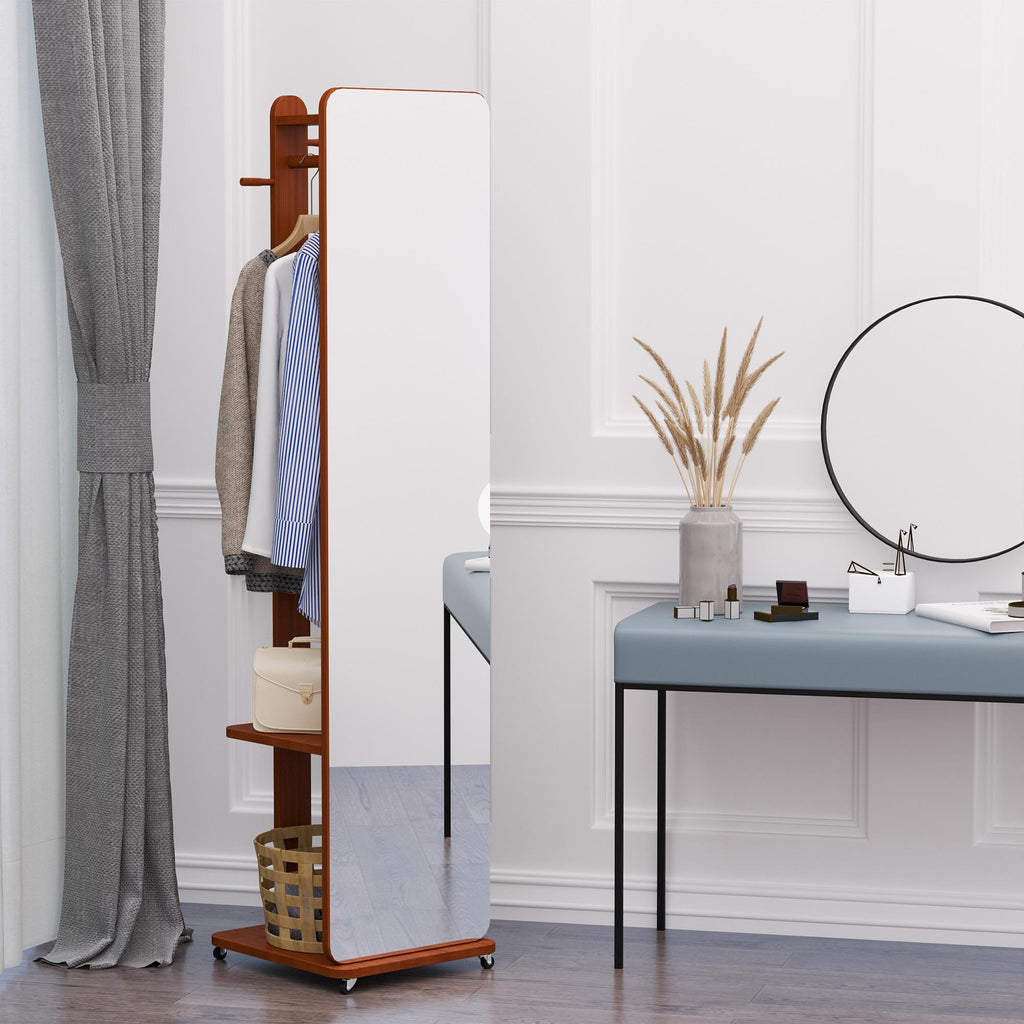 Mit diesem praktischen freistehenden 2-in-1-Spiegel haben Sie Ihre Kleidung immer griffbereit. Es ermöglicht Ihnen nicht nur, einen Ganzkörperspiegel mitzunehmen, um Ihr tägliches Aussehen zu überprüfen, sondern es ist auch ein Kleiderbügelspiegel. Kleiderbügel, Haken und Heckablagen ermöglichen eine geordnete Aufbewahrung von Kleidung und Accessoires, sodass diese immer griffbereit sind. Platzsparend und dank der Räder leicht zu bewegen, ist es das perfekte Möbelstück für jeden Raum.