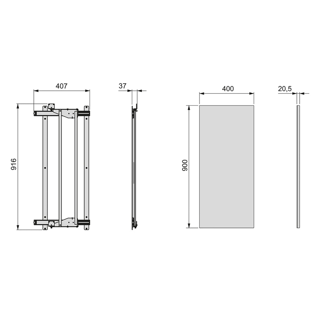 Ausziehbarer Spiegel für Innengarderobe, mit matt eloxiertem Aluminiumrahmen 900x400mm . Die Struktur, die ihn trägt, ist mit Kugelführungen für seine Extraktion ausgestattet. Wenn Sie den Spiegel herausnehmen, dreht er sich auf dem Ständer, um ihn nach Ihren Wünschen auszurichten.