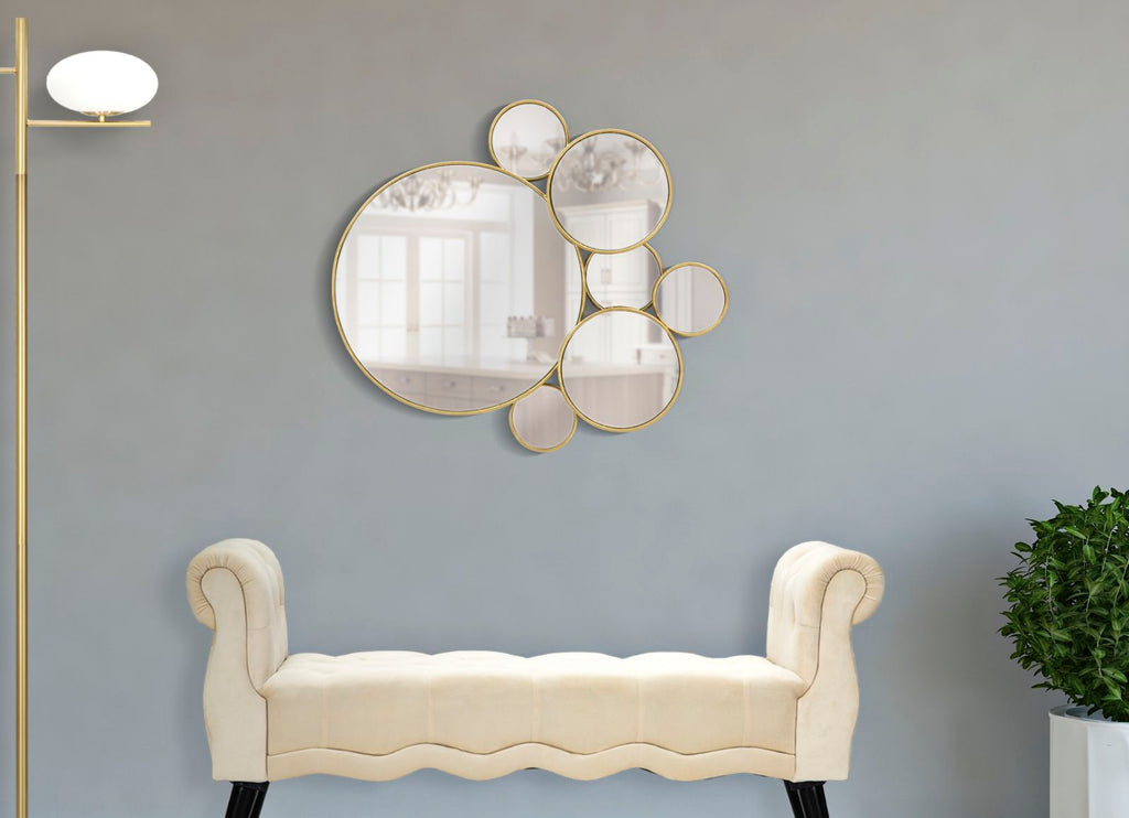 Zusammensetzung aus runden Wandspiegeln aus Metall. Goldene Spiegel sind ein Must-Have des Retro-Glam-Stils. Spiegel sind ein großartiges Werkzeug, um Räume optisch zu erweitern.Der runde Spiegel schafft ein originelles und ausgewogenes Ganzes und ist perfekt am Eingang oder über einer Konsole platziert.