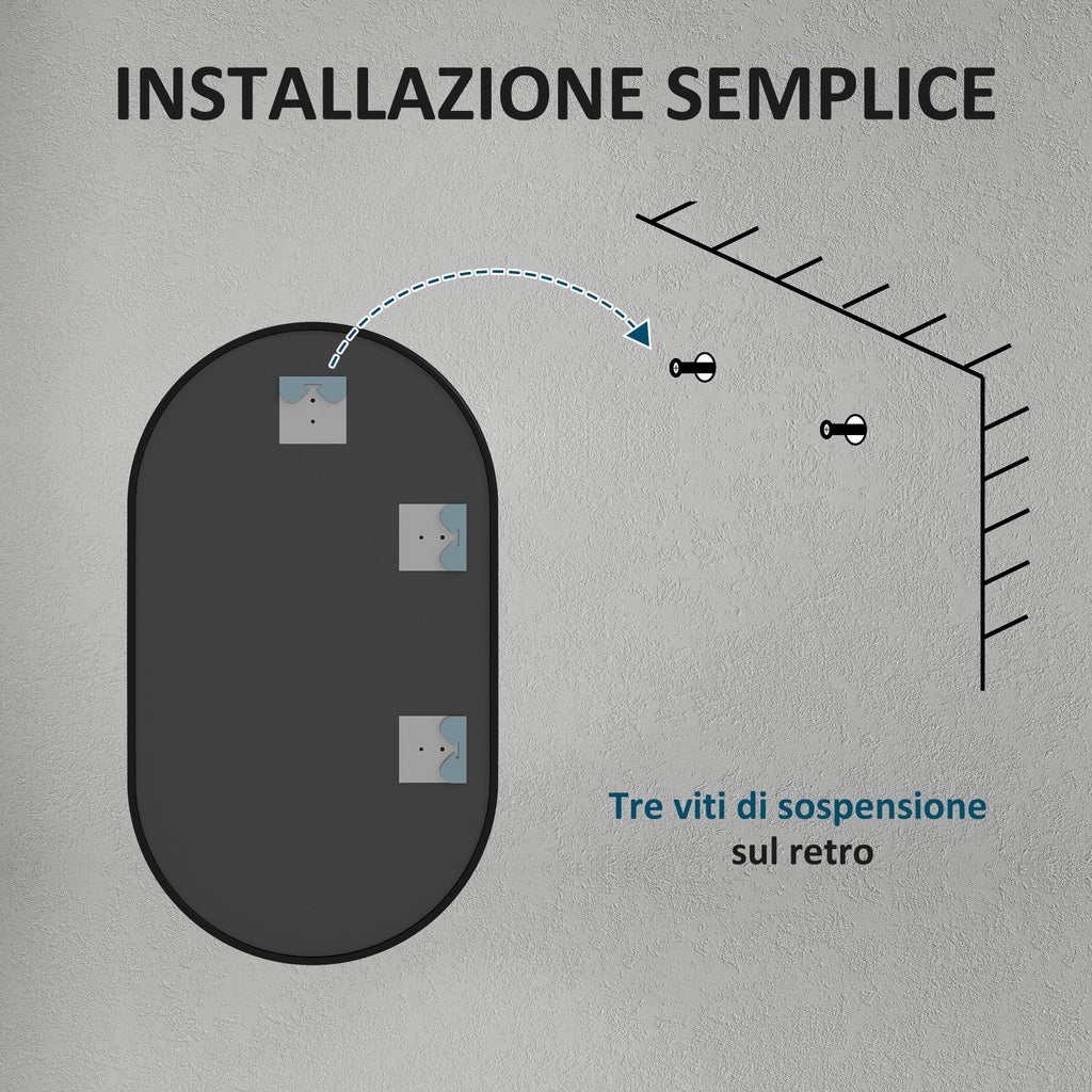 Specchio per Bagno Ovale a 3 Ganci 40x70x3 cm in Lega di Alluminio e Vetro Nero