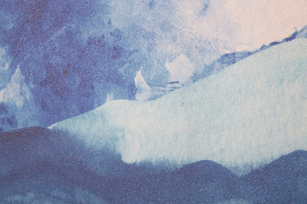 Questa stampa su tela con telaio in legno evoca un'atmosfera impressionista ispirata a un suggestivo paesaggio di montagna. Le tonalità blu dominanti, mescolate alle delicate decorazioni dorate, creano un contrasto sorprendente che trasmette un senso di magia e mistero. Perfetta per arricchire qualsiasi ambiente, dona un tocco di eleganza e serenità attraverso il suo design raffinato e suggestivo.